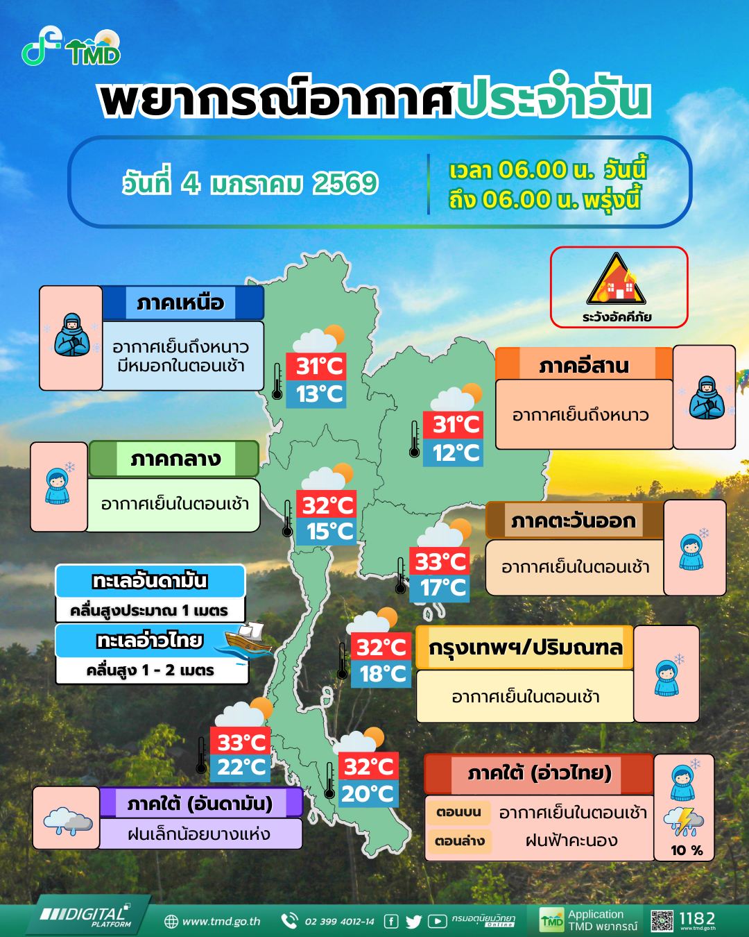 4 มกราคม 2569 พยากรณ์อากาศ 24 ชั่วโมงข้างหน้า ภาคเหนือและภาคตะวันออกเฉียงเหนือมีอากาศหนาว ส่วนภาคกลาง รวมทั้งกรุงเทพมหานครและปริมณฑล ภาคตะวันออก และภาคใต้ตอนบนมีอากาศเย็นในตอนเช้า เนื่องจากบริเวณความกดอากาศสูงหรือมวลอากาศเย็นจากประเทศจีนปกคลุมประเทศไทยตอนบนและภาคใต้ตอนบน ขอให้ประชาชนในบริเวณดังกล่าวดูแลรักษาสุขภาพเนื่องจากสภาพอากาศที่หนาวเย็นลง รวมทั้งระวังอันตรายจากอัคคีภัยเนื่องจากสภาพอากาศแห้ง