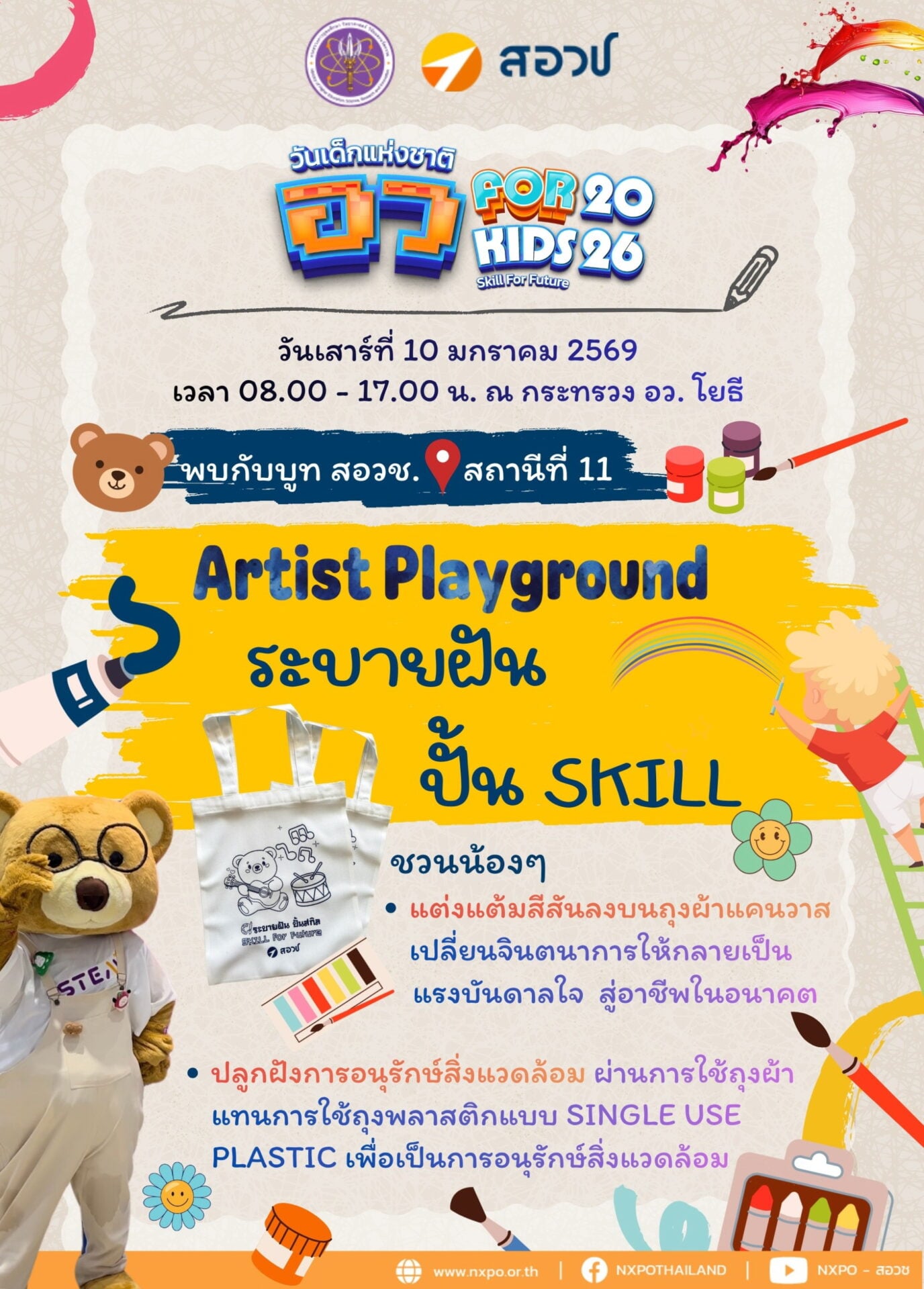 9 ม.ค. 2569 - กระทรวงการอุดมศึกษา วิทยาศาสตร์ วิจัยและนวัตกรรม (อว.) เตรียมจัดงานวันเด็กแห่งชาติ ประจำปี 2569 “อว. For Kids” ภายใต้แนวคิด “Skill for Future: เด็กสนุกสกิลล้ำ” ชวนเด็กและเยาวชนเรียนรู้ผ่านการลงมือทำจริง เปลี่ยนจินตนาการให้กลายเป็นทักษะสำคัญสำหรับโลกอนาคต ในวันเสาร์ที่ 10 มกราคม 2569 ตั้งแต่เวลา 08.00–17.00 น. ณ กระทรวง อว. โยธี โดย สำนักงานสภานโยบายการอุดมศึกษา วิทยาศาสตร์ วิจัยและนวัตกรรม (สอวช.) ร่วมจัดกิจกรรมในบูท “Artist Playground: ระบายฝัน ปั้น Skill” ซึ่งออกแบบให้เป็นสนามสร้างสรรค์สำหรับเด็ก ๆ ได้ทดลอง คิด เล่น และเรียนรู้ไปพร้อมกัน ภายในโซน Artist Playground เด็ก ๆ จะได้ร่วมกิจกรรมเพ้นต์สีลงบนถุงผ้าแคนวาส ถ่ายทอดจินตนาการอย่างอิสระ พร้อมต่อยอดความคิดสร้างสรรค์ให้กลายเป็นแรงบันดาลใจสู่เส้นทางอาชีพในอนาคต