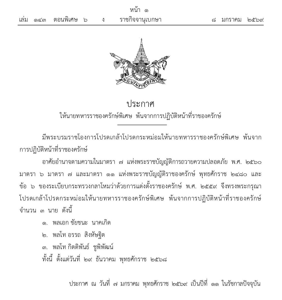 9 มกราคม 2569 - เว็บไซต์ราชกิจจานุเบกษา เผยแพร่ประกาศให้นายทหารราชองครักษ์พิเศษ พ้นจากการปฏิบัติหน้าที่ราชองครักษ์