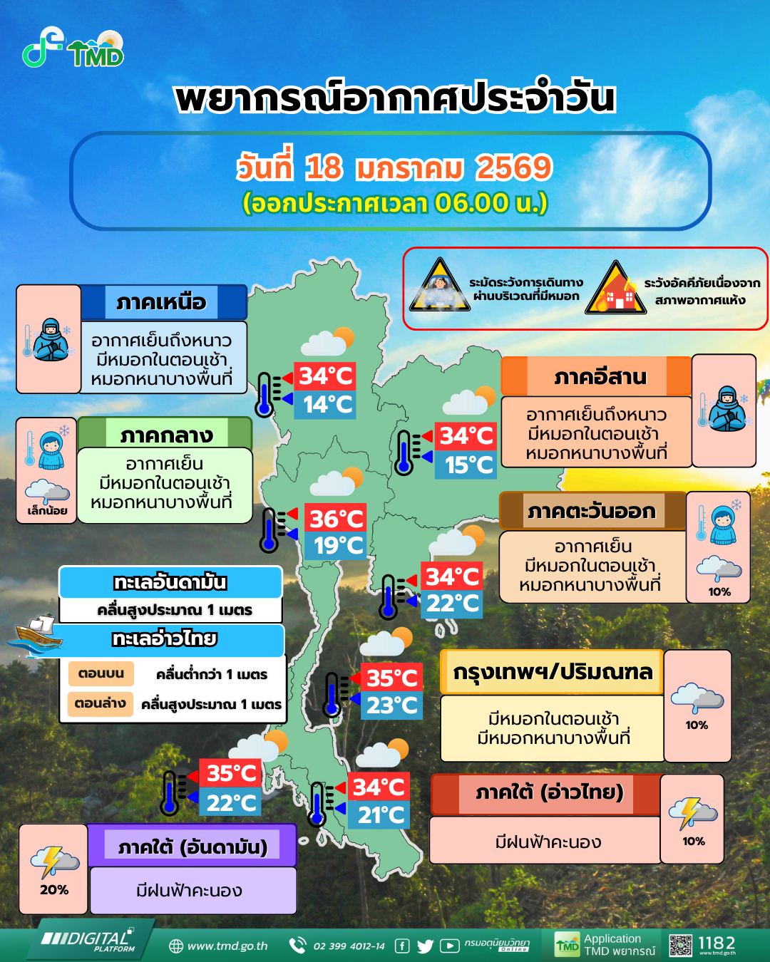 18 ม.ค. 2569 – กรมอุตุนิยมวิทยา รายงานพยากรณ์อากาศ 24 ชั่วโมงข้างหน้า ประเทศไทยตอนบนมีอากาศเย็นกับมีหมอกในตอนเช้าและมีหมอกหนาบางพื้นที่ โดยภาคเหนือและภาคตะวันออกเฉียงเหนือตอนบนยังคงมีอากาศเย็นถึงหนาว เนื่องจากบริเวณความกดอากาศสูงหรือมวลอากาศเย็นกำลังอ่อนปกคลุมประเทศไทยตอนบน ในขณะที่ลมฝ่ายตะวันตกจากประเทศเมียนมาเคลื่อนเข้าปกคลุมภาคเหนือตอนบนและลาวตอนบน ส่วนภาคกลางตอนล่างและภาคตะวันออกมีฝนเล็กน้อยบางแห่ง เนื่องจากมีลมตะวันออกเฉียงใต้พัดนำความชื้นเข้ามาปกคลุม ขอให้ประชาชนดูแลรักษาสุขภาพเนื่องจากสภาพอากาศที่เปลี่ยนแปลง และเพิ่มความระมัดระวังในการสัญจรผ่านบริเวณที่มีหมอก รวมทั้งระวังอันตรายจากอัคคีภัยเนื่องจากสภาพอากาศแห้งไว้ด้วย