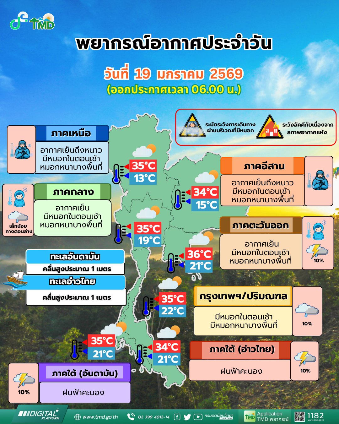 19 ม.ค. 2569 – กรมอุตุนิยมวิทยา พยากรณ์อากาศ 24 ชั่วโมงข้างหน้าว่า ประเทศไทยตอนบนมีอากาศเย็นกับมีหมอกในตอนเช้าและมีหมอกหนาบางพื้นที่ โดยภาคเหนือและภาคตะวันออกเฉียงเหนือ ตอนบนยังคงมีอากาศเย็นถึงหนาว เนื่องจากบริเวณความกดอากาศสูงหรือมวลอากาศเย็นกำลังอ่อนปกคลุมประเทศไทยตอนบน ในขณะที่ลมฝ่ายตะวันตกจากประเทศเมียนมาเคลื่อนเข้าปกคลุมภาคเหนือตอนบนและลาวตอนบน ส่วนภาคกลางตอนล่างและภาคตะวันออกมีฝนบางแห่ง เนื่องจากมีลมตะวันออกเฉียงใต้พัดนำความชื้นเข้ามาปกคลุม ขอให้ประชาชนดูแลรักษาสุขภาพเนื่องจากสภาพอากาศที่เปลี่ยนแปลง และเพิ่มความระมัดระวังในการสัญจรผ่านบริเวณที่มีหมอก รวมทั้งระวังอันตรายจากอัคคีภัยเนื่องจากสภาพอากาศแห้งไว้ด้วย