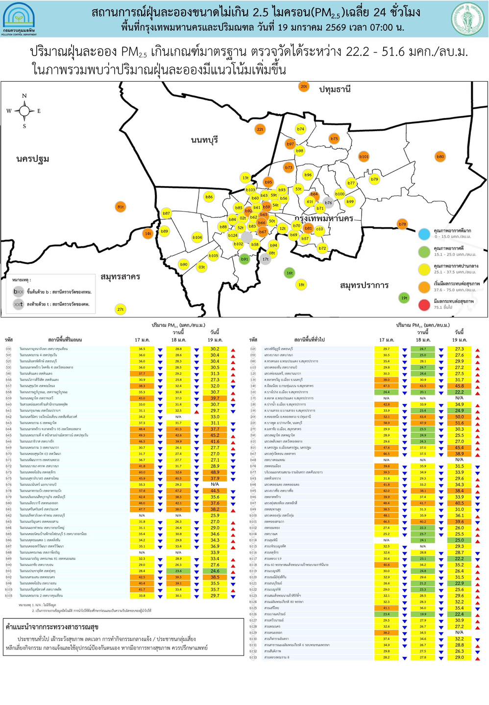 19 ม.ค. 2569 – ศูนย์สื่อสารการแก้ไขปัญหามลพิษทางอากาศ รายงานการติดตามตรวจสอบคุณภาพอากาศประจำวันที่ 19 มกราคม 2569 ณ 07:00 น. สรุปดังนี้