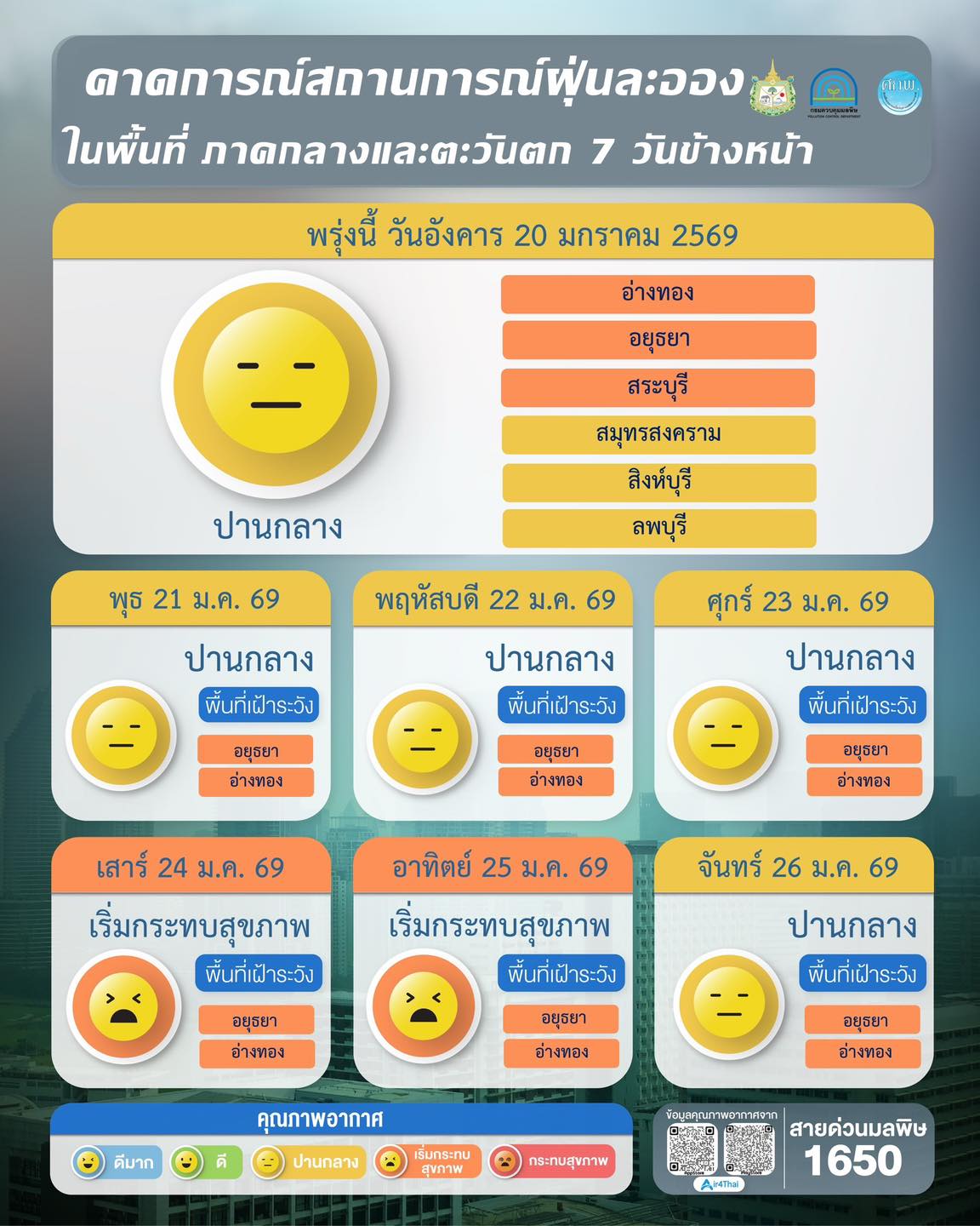 ผลการคาดการณ์สถานการณ์ฝุ่นละออง 7 วันข้างหน้า ระหว่างวันที่ 20 – 26 มกราคม 2569
