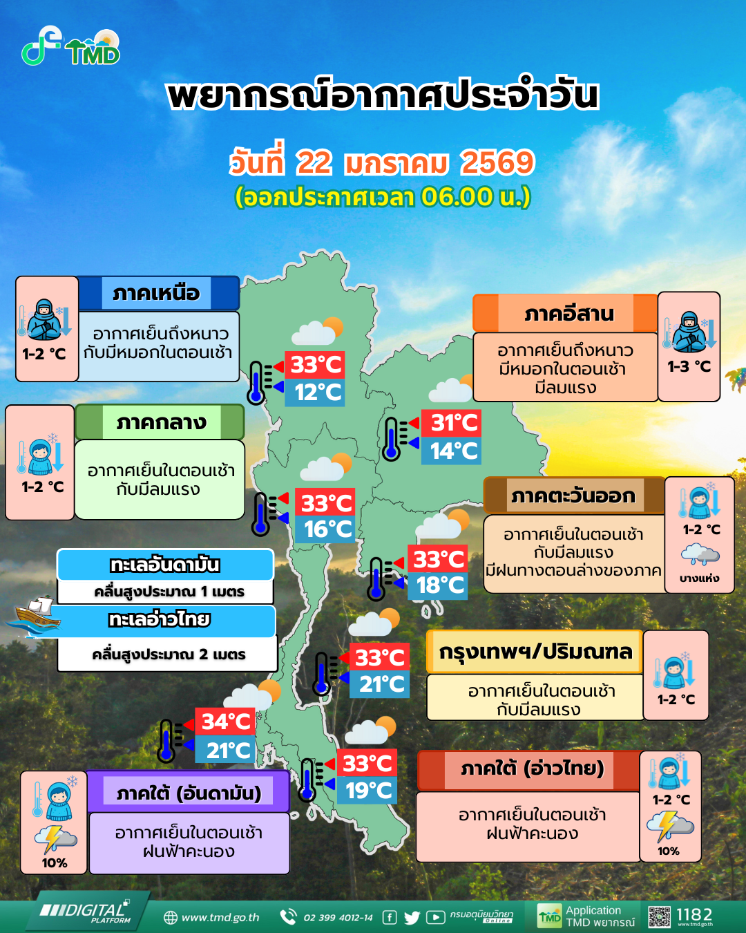 22 ม.ค.2569 - กรมอุตุนิยมวิทยาได้พยากรณ์อากาศ 24 ชั่วโมงข้างหน้าในลักษณะทั่วไป ว่าประเทศไทยตอนบน และภาคใต้ตอนบนจะมีอุณหภูมิลดลง กับมีลมแรง โดยภาคตะวันออกเฉียงเหนืออุณหภูมิจะลดลง 1-3 องศาเซลเซียส ส่วนภาคเหนือ ภาคกลาง รวมทั้งกรุงเทพมหานครและปริมณฑล ภาคตะวันออก และภาคใต้ตอนบน อุณหภูมิจะลดลง 1-2 องศาเซลเซียส เนื่องจากบริเวณความกดอากาศสูงหรือมวลอากาศเย็นกำลังปานกลางระลอกใหม่จากประเทศจีนได้แผ่ปกคลุมประเทศไทยตอนบนแล้ว ในขณะที่ภาคกลางตอนล่างมีฝนบางแห่ง เนื่องจากมีลมตะวันออกพัดปกคลุมในบริเวณดังกล่าว ขอให้ประชาชนดูแลรักษาสุขภาพเนื่องจากสภาพอากาศที่เปลี่ยนแปลง
