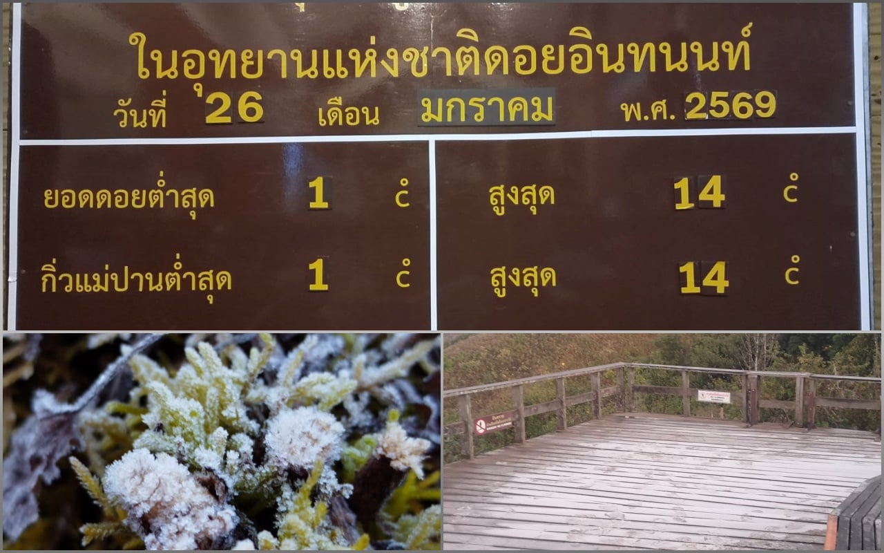 26 ม.ค.2569-นายจิรนิติ เชิงสะอาด หัวหน้าอุทยานแห่งชาติดอยอินทนนท์จังหวัดเชียงใหม่ เปิดเผยว่า บรรยากาศบนยอดดอยยังคงมีนักท่องเที่ยวคึกคักต่อเนื่องและได้สัมผัสอากาศหนาวกันจุใจทุกวันและวันนี้สภาพอากาศก็หนาวเย็นทำสถิติอุณหภูมิต่ำสุดของฤดูหนาวปีนี้อีกรอบที่ 1 องศาเซลเซียส ทั้งที่บริเวณอยู่แม่ปานและหน่วยพิทักษ์อุทยานฯ