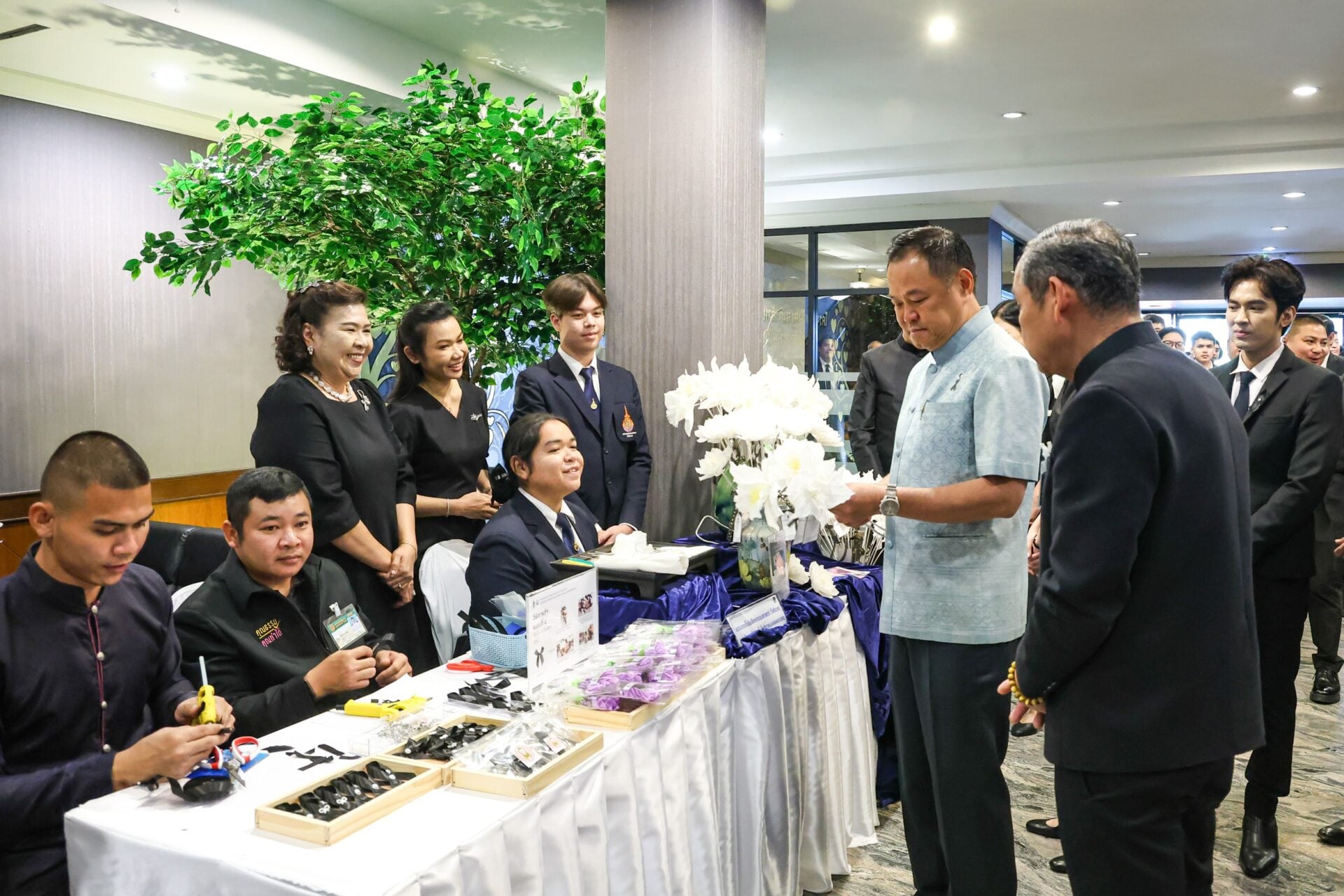 นายกรัฐมนตรี พร้อมด้วยคณะรัฐมนตรี ร่วมเขียนปณิธานทำความดีประดับต้นไม้แห่งความดี เพื่อแสดงเจตนารมณ์ในการบำเพ็ญประโยชน์เพื่อสังคม พร้อมเยี่ยมชมการสาธิตการจัดทำริบบิ้นแสดงความอาลัย การประดิษฐ์ดอกไม้ในพระนามาภิไธย “ควีนสิริกิติ์” เพื่อน้อมรำลึกในพระมหากรุณาธิคุณ สมเด็จพระนางเจ้าสิริกิติ์ พระบรมราชินีนาถ พระบรมราชชนนีพันปีหลวง จากนั้น นายกรัฐมนตรี พร้อมด้วยคณะรัฐมนตรี และผู้บริหารกระทรวงวัฒนธรรม พร้อมทั้งผู้แทนจากหน่วยงานร่วมบูรณาการ ถ่ายภาพหมู่ร่วมกัน