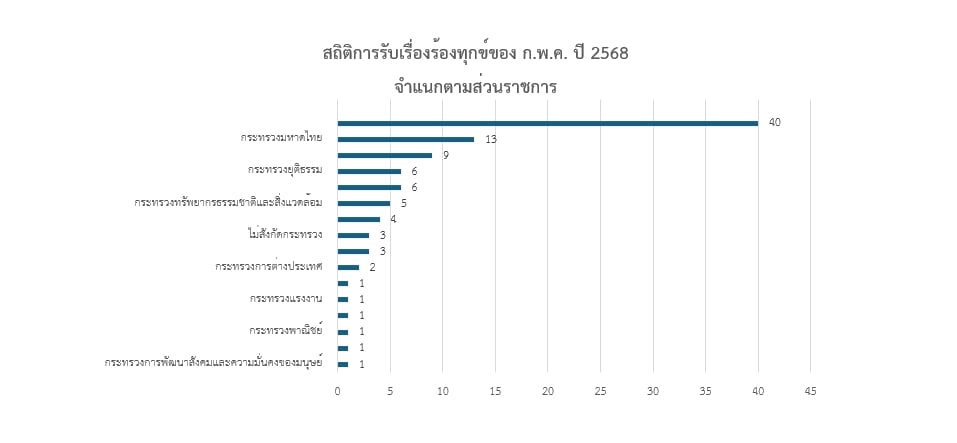 สำหรับสถิติการรับเรื่องร้องทุกข์ในปี พ.ศ. 2568 ก.พ.ค. มีการรับคำร้องทุกข์รวมทั้งสิ้น จำนวน97 เรื่อง เมื่อจำแนกตามส่วนราชการที่ผู้ยื่นคำร้องทุกข์สังกัด พบว่ามีผู้ยื่นคำร้องทุกข์จากกระทรวงสาธารณสุขมากที่สุด จำนวน 40 เรื่อง รองลงมา ได้แก่ กระทรวงมหาดไทย จำนวน 13 เรื่อง กระทรวงศึกษาธิการ จำนวน 9 เรื่อง กระทรวงเกษตรและสหกรณ์ และกระทรวงยุติธรรม กระทรวงละ 6 เรื่อง กระทรวงทรัพยากรธรรมชาติและสิ่งแวดล้อม จำนวน 5 เรื่อง สำนักนายกรัฐมนตรี จำนวน 4 เรื่อง กระทรวงอุตสาหกรรม และผู้ยื่นคำร้องทุกข์ที่ไม่สังกัดกระทรวง กระทรวงละ 3 เรื่อง กระทรวงการต่างประเทศ จำนวน 2 เรื่อง ส่วนกระทรวงการพัฒนาสังคมและความมั่นคงของมนุษย์ กระทรวงการคลัง กระทรวงพาณิชย์ กระทรวงการอุดมศึกษา วิทยาศาสตร์ วิจัยและนวัตกรรม กระทรวงแรงงาน และกระทรวงพลังงาน มีจำนวนกระทรวงละ 1 เรื่อง