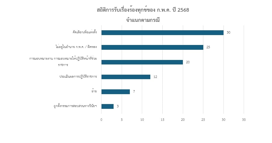 พร้อมกันนี้ เมื่อจำแนกสถิติการรับเรื่องร้องทุกข์ในปี พ.ศ. 2568 ตามลักษณะกรณีที่มีการยื่นคำร้องทุกข์ พบว่าส่วนใหญ่เป็นกรณีเกี่ยวกับการคัดเลือกเพื่อแต่งตั้ง จำนวน 30 เรื่อง รองลงมา ได้แก่กรณีการมอบหมายงานหรือการมอบหมายให้ปฏิบัติหน้าที่ช่วยราชการ จำนวน 20 เรื่อง กรณีการประเมินผลการปฏิบัติราชการ จำนวน 12 เรื่อง และกรณีการย้าย จำนวน 7 เรื่อง ขณะที่กรณีถูกตั้งคณะกรรมการสอบสวนทางวินัย มีจำนวน 3 เรื่อง นอกจากนี้ ยังมีกรณีที่ไม่อยู่ในอำนาจการพิจารณาของ ก.พ.ค. หรือเป็นการยื่นคำร้องผิดหน่วยงาน (ผิดหลง) จำนวน 25 เรื่อง