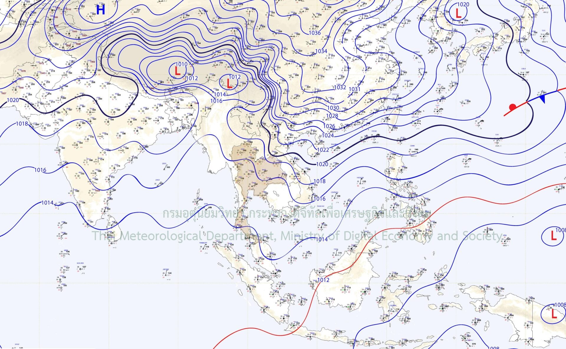 กรมอุตุนิยมวิทยา พยากรณ์อากาศ 24 ชั่วโมงข้างหน้าว่า บริเวณความกดอากาศสูงหรือมวลอากาศเย็นกำลังปานกลางถึงค่อนข้างแรงระลอกใหม่จากประเทศจีนได้แผ่ลงมาปกคลุมประเทศไทยตอนบนแล้ว