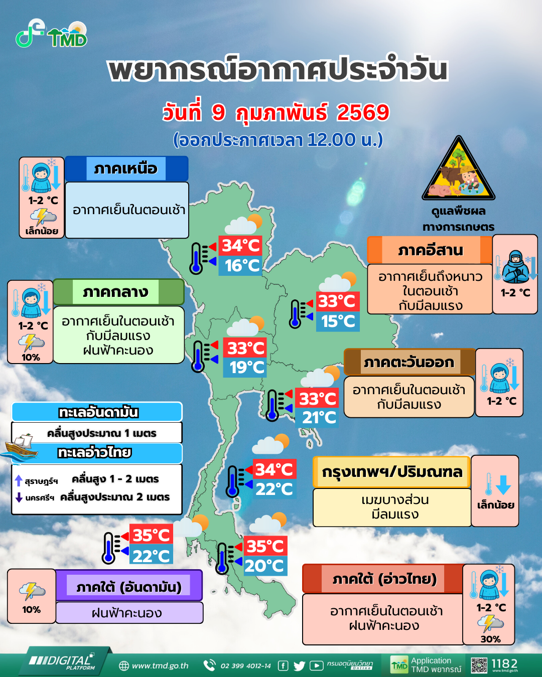 10 ก.พ.2569- กรมอุตุนิยมวิทยาพยากรณ์อากาศ 24 ชั่วโมงข้างหน้า ประเทศไทยตอนบนยังคงมีอากาศเย็นในตอนเช้า โดยมีฝนเล็กน้อยบางแห่งในภาคเหนือ เนื่องจากบริเวณความกดอากาศสูงหรือมวลอากาศเย็นกำลังปานกลางถึงค่อนข้างแรงจากประเทศจีนปกคลุมประเทศไทยตอนบน และทะเลจีนใต้ ในขณะที่มีลมตะวันออกเฉียงใต้พัดปกคลุมภาคเหนือ ขอให้ประชาชนบริเวณประเทศไทยตอนบนดูแลรักษาสุขภาพเนื่องจากสภาพอากาศที่เปลี่ยนแปลง ส่วนเกษตรกรในภาคเหนือควรเตรียมการป้องกันและระวังความเสียหายที่จะเกิดต่อผลผลิตทางการเกษตร เนื่องจากยังคงมีฝนในบางพื้นที่