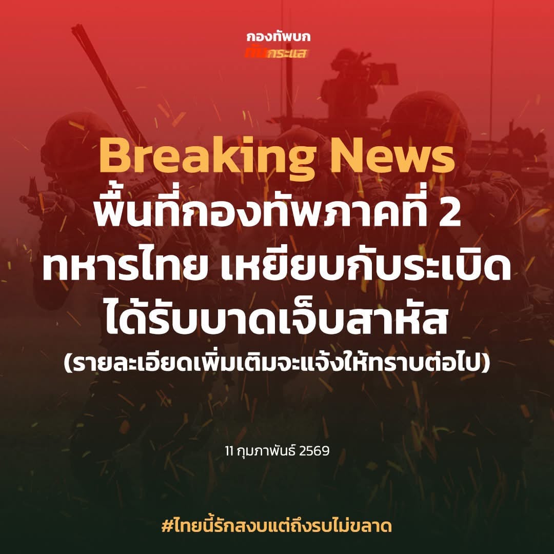 11 กุมภาพันธ์ 2569 - มีรายงานความคืบหน้าสถานการณ์ชายแดนไทย-กัมพูชา ล่าสุด เพจเฟซบุ๊ก กองทัพบกทันกระแส โพสต์ข้อความเมื่อเวลา 17.22 น. ระบุว่า Breaking News พื้นที่กองทัพภาคที่ 2 ทหารไทยเหยียบกับระเบิดได้รับบาดเจ็บสาหัส