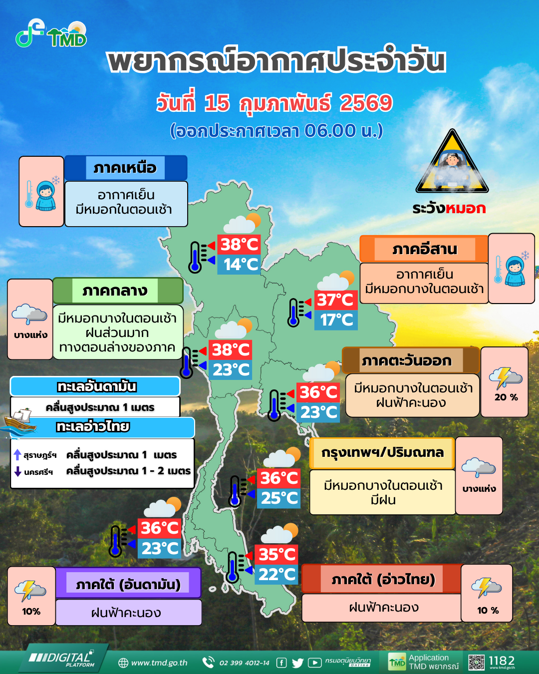 15 ก.พ. 2569 – กรมอุตุนิยมวิทยา รายงานลักษณะอากาศทั่วไป และพยากรณ์อากาศ 24 ชั่วโมงข้างหน้า ภาคเหนือและภาคตะวันออกเฉียงเหนือยังคงมีอากาศเย็นกับมีหมอกในตอนเช้า ส่วนภาคตะวันออก และภาคกลาง รวมทั้งกรุงเทพมหานครและปริมณฑลมีฝนฟ้าคะนองบางแห่ง เนื่องจากบริเวณความกดอากาศสูงหรือมวลอากาศเย็นกำลังอ่อนปกคลุมประเทศไทยตอนบน และทะเลจีนใต้ ส่งผลทำให้มีลมตะวันออกเฉียงใต้พัดนำความชื้นจากอ่าวไทยเข้ามาปกคลุมภาคตะวันออก และภาคกลาง รวมทั้งกรุงเทพมหานครและปริมณฑล ขอให้ประชาชนบริเวณประเทศไทยตอนบนดูแลรักษาสุขภาพเนื่องจากสภาพอากาศที่เปลี่ยนแปลง รวมทั้งเพิ่มความระมัดระวังในการสัญจรผ่านบริเวณที่มีหมอกไว้ด้วย