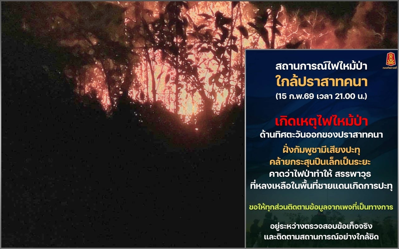 16 ก.พ.2569-ความคืบหน้าเหตุไฟไหม้ป่าฝั่งประเทศกัมพูชา เมื่อเวลา 22.00 น. วันที่ 15 ก.พ.ที่ผ่านมา มีรายงานข่าวเบื้องต้นว่า เกิดไฟลุกไหม้ ฝั่งประเทศกัมพูชา บริเวณหน้าแนว ห่างจากปราสาทตาเมือนธม ระยะประมาณ 80 เมตร จากนั้นเกิดเสียงระเบิดจำนวน 1 ครั้ง ในพื้นที่ดังกล่าว เบื้องต้นคาดการณ์ว่าอาจเกิดจากไฟเผาป่า ที่ลุกลามไปจุดชนวนกระสุนปืนค้างเก่าที่อยู่ในพื้นที่แนวชายแดน จนทำให้เกิดการระเบิดขึ้น ขณะนี้ยังไม่มีรายงานผู้ได้รับบาดเจ็บหรือความเสียหายเพิ่มเติม โดยหน่วยงานที่เกี่ยวข้องอยู่ระหว่างตรวจสอบข้อเท็จจริงและติดตามสถานการณ์อย่างใกล้ชิด