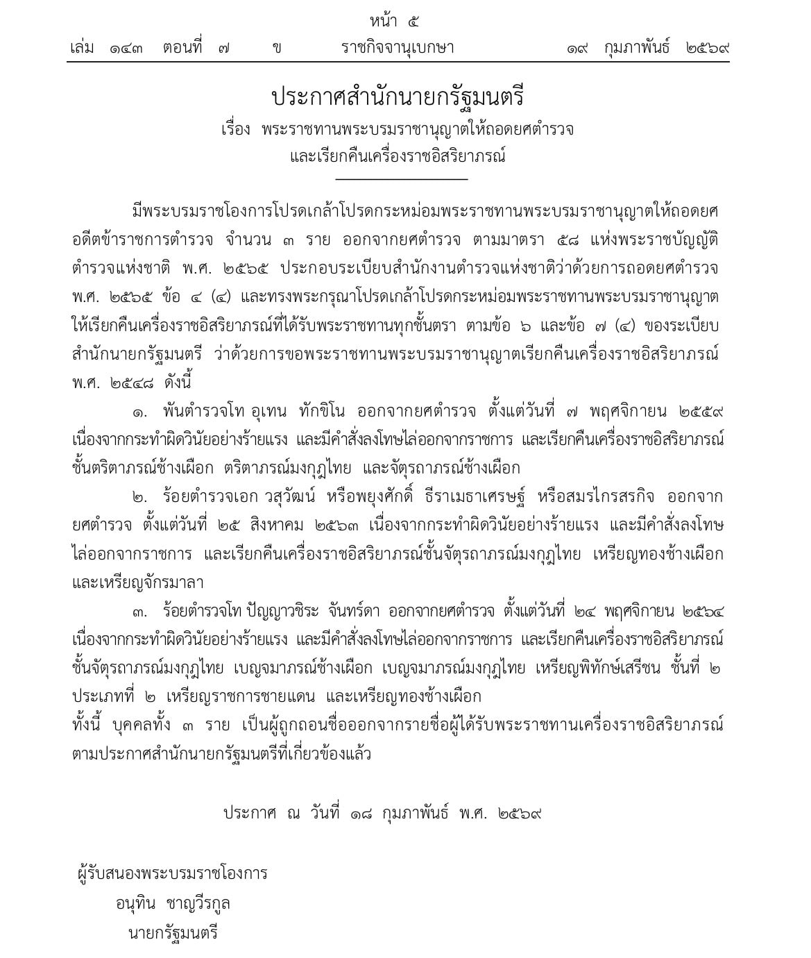 20 กุมภาพันธ์ 2569 - เว็บไชต์ราชกิจจานุเบกษา เผยแพร่ประกาศสำนักนายกรัฐมนตรี เรื่อง พระราชทานพระบรมราชานุญาตให้ถอดยศตำรวจและเรียกคืนเครื่องราชอิสริยาภรณ์