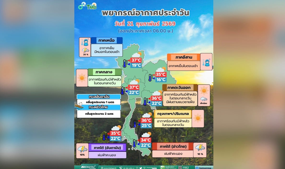 กรมอุตุนิยมวิทยาออกประกาศ 21 ก.พ. 69 ระบุ 24 ชั่วโมงข้างหน้า ประเทศไทยมีสภาพอากาศหลากหลาย เหนือมีฝนฟ้าคะนองบางแห่ง อีสานเช้าอากาศเย็น ภาคกลาง–กทม.อากาศร้อน ใต้คลื่นอ่าวไทยตอนล่างสูงราว 2 เมตร พร้อมเตือนช่วง 23-25 ก.พ. ไทยตอนบนเสี่ยงพายุฤดูร้อน