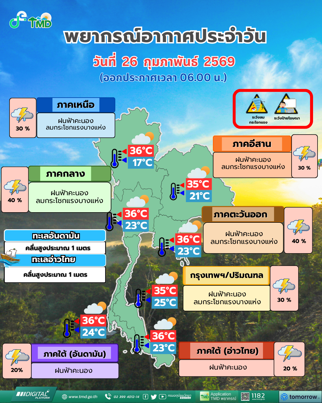 26 ก.พ.2569 - กรมอุตุนิยมวิทยาได้พยากรณ์อากาศ 24 ชั่วโมงข้างหน้าในลักษณะทั่วไป ว่าประเทศไทยตอนบนจะมีฝนลดลง แต่ยังมีฝนฟ้าคะนองและลมกระโชกแรงเกิดขึ้นได้บางพื้นที่ เนื่องจากมีลมใต้และลมตะวันออกเฉียงใต้พัดนำความชื้นเข้ามาปกคลุมประเทศไทยตอนบน และอ่าวไทย ในขณะที่มีลมฝ่ายตะวันตกในระดับบนปกคลุมภาคเหนือตอนบนและภาคตะวันออกเฉียงเหนือตอนบน ประกอบกับความกดอากาศต่ำเนื่องจากความร้อนปกคลุมประเทศไทยตอนบน ทำให้มีอากาศร้อนขึ้นในตอนกลางวัน ขอให้ประชาชนบริเวณประเทศไทยตอนบนระวังอันตรายจากฝนฟ้าคะนองและลมกระโชกแรงที่จะเกิดขึ้น โดยหลีกเลี่ยงการอยู่ในที่โล่งแจ้ง ใต้ต้นไม้ใหญ่สิ่งปลูกสร้าง และป้ายโฆษณาที่ไม่แข็งแรง รวมทั้งดูแลรักษาสุขภาพเนื่องจากสภาพอากาศที่เปลี่ยนแปลงไว้ด้วย