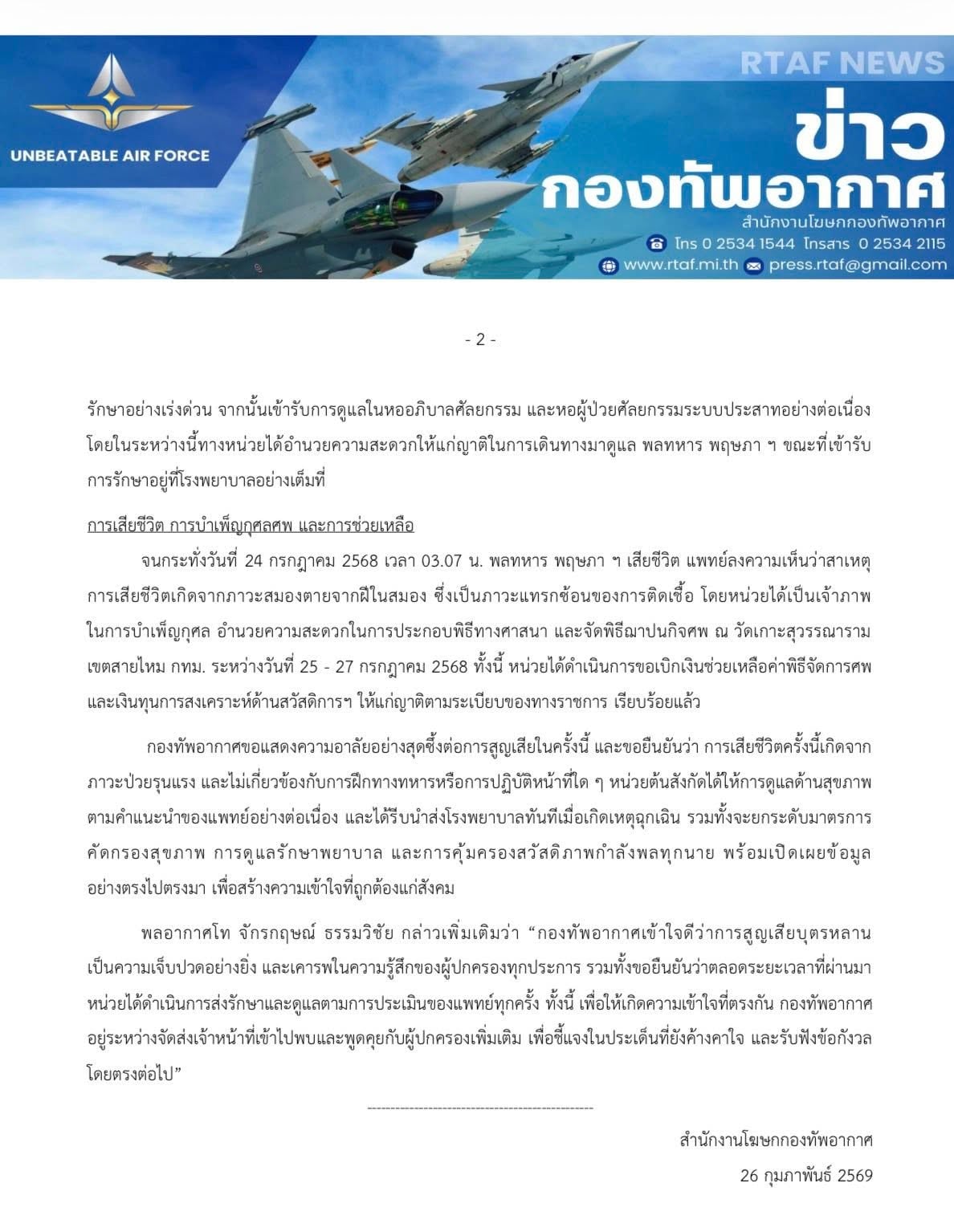 กองทัพอากาศขอแสดงความอาลัยอย่างสุดซึ้งต่อการสูญเสียในครั้งนี้ และขอยืนยันว่า การเสียชีวิตครั้งนี้เกิดจากภาวะป่วยรุนแรง และไม่เกี่ยวข้องกับการฝึกทางทหารหรือการปฏิบัติหน้าที่ใด ๆ หน่วยต้นสังกัดได้ให้การดูแลด้านสุขภาพตามคำแนะนำของแพทย์อย่างต่อเนื่อง และได้รีบนำส่งโรงพยาบาลทันทีเมื่อเกิดเหตุฉุกเฉิน รวมทั้งจะยกระดับมาตรการ คัดกรองสุขภาพ การดูแลรักษาพยาบาล และการคุ้มครองสวัสดิภาพกำลังพลทุกนาย พร้อมเปิดเผยข้อมูลอย่างตรงไปตรงมา เพื่อสร้างความเข้าใจที่ถูกต้องแก่สังคม