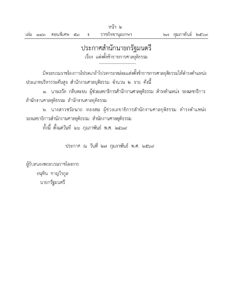 27 กุมภาพันธ์ 2569 - เว็บไซต์ราชกิจจานุเบกษาเผยแพร่ ประกาศสำนักนายกรัฐมนตรี เรื่อง แต่งตั้งข้าราชการศาลยุติธรรม