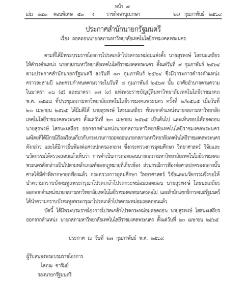 28 กุมภาพันธ์ 2569 - เว็บไซต์ราชกิจจานุเบกษา เผยแพร่ประกาศสำนักนายกรัฐมนตรีเรื่อง ถอดถอนนายกสภามหาวิทยาลัยเทคโนโลยีราชมงคลพระนคร
