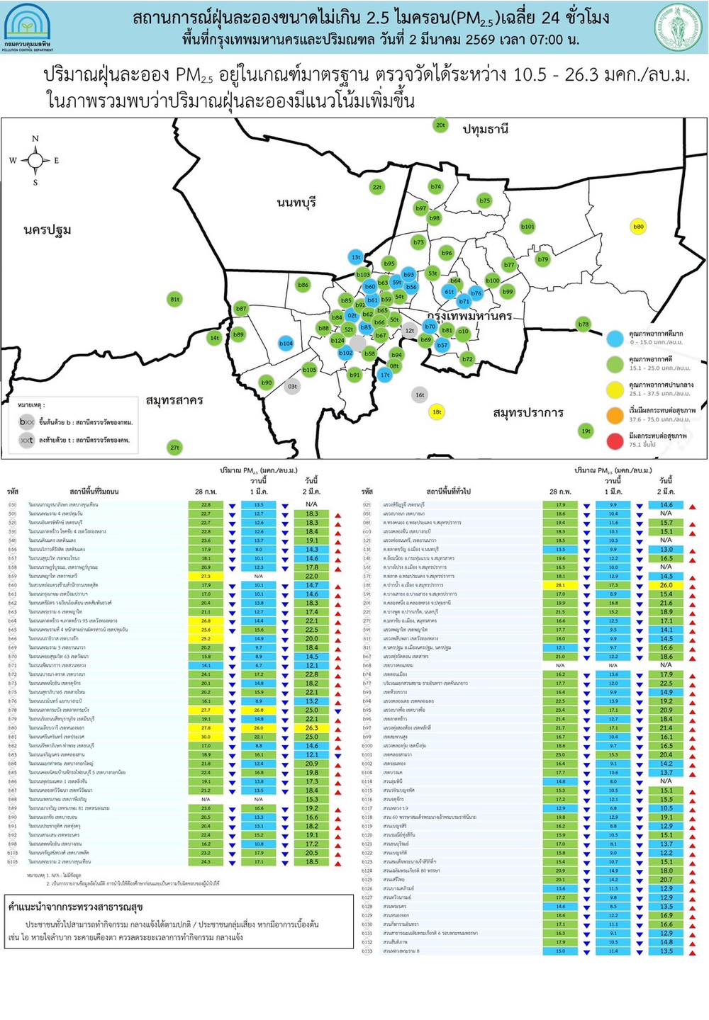 2 มี.ค. 2569 – ศูนย์สื่อสารการแก้ไขปัญหามลพิษทางอากาศ รายงานการติดตามตรวจสอบคุณภาพอากาศประจำวันที่ 2 มีนาคม 2569 ณ 07:00 น. สรุปดังนี้