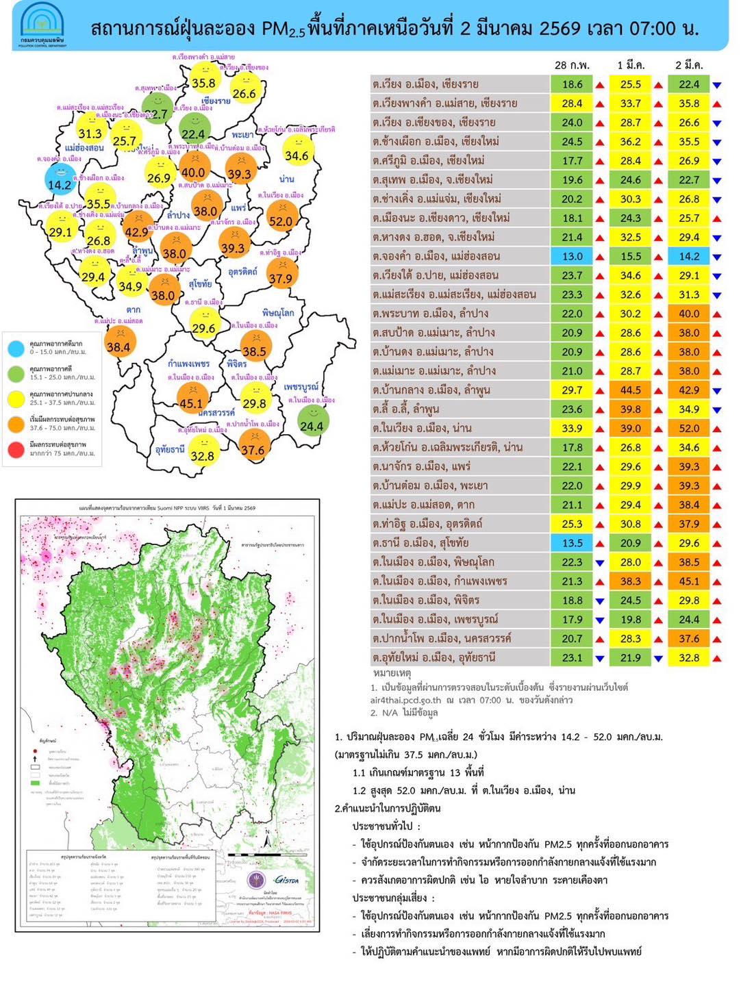 ภาพรวมปริมาณ PM2.5 ในประเทศพบเกินค่ามาตรฐานใน จ.พะเยา จ.น่าน จ.ลำพูน จ.ลำปาง จ.แพร่ จ.อุตรดิตถ์ จ.พิษณุโลก จ.ตาก จ.กำแพงเพชร จ.นครสวรรค์ และ จ.หนองคาย