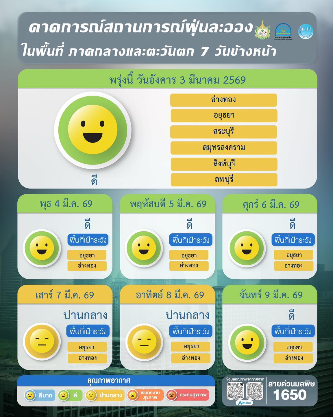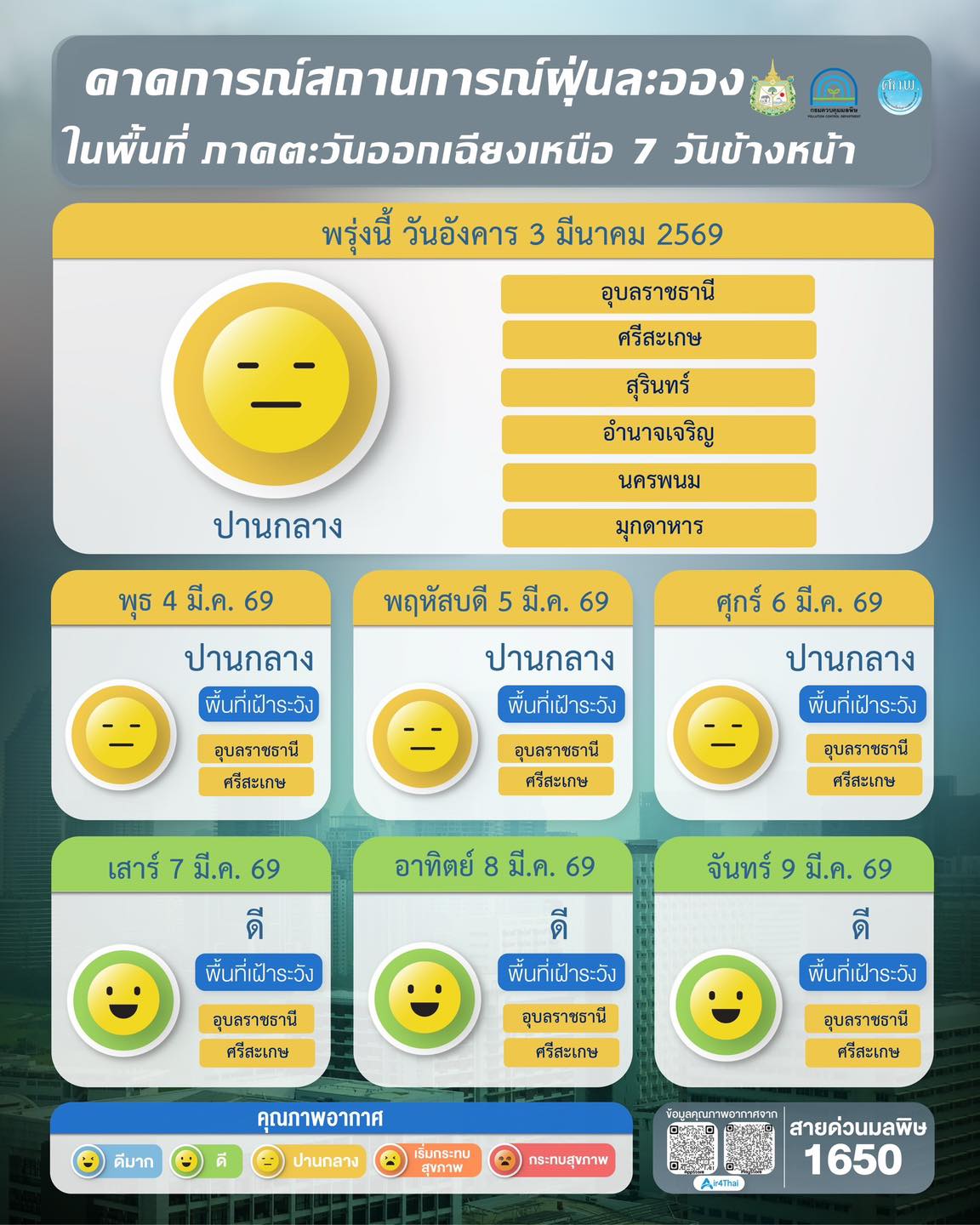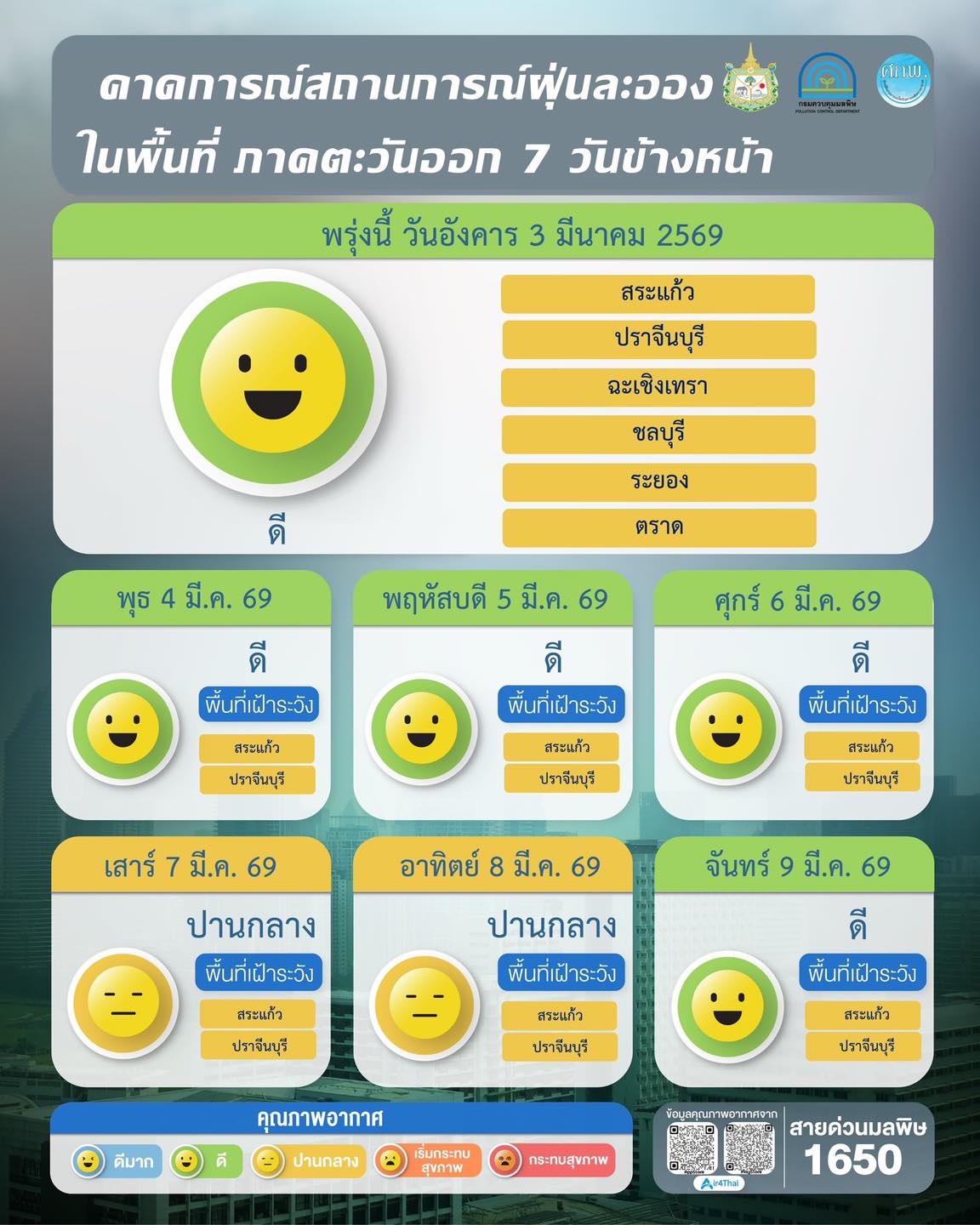 ผลการคาดการณ์สถานการณ์ฝุ่นละออง 7 วันข้างหน้า ระหว่างวันที่ 3 – 9 มีนาคม 2569