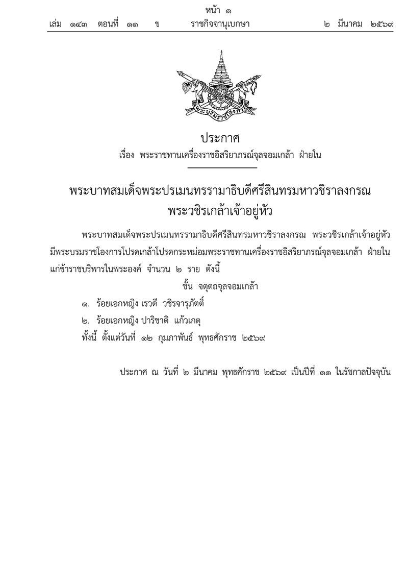 3 มีนาคม 2569 - เว็บไซต์ราชกิจจานุเบกษา เผยแพร่ประกาศ เรื่อง พระราชทานเครื่องราชอิสริยาภรณ์จุลจอมเกล้า ฝ่ายใน