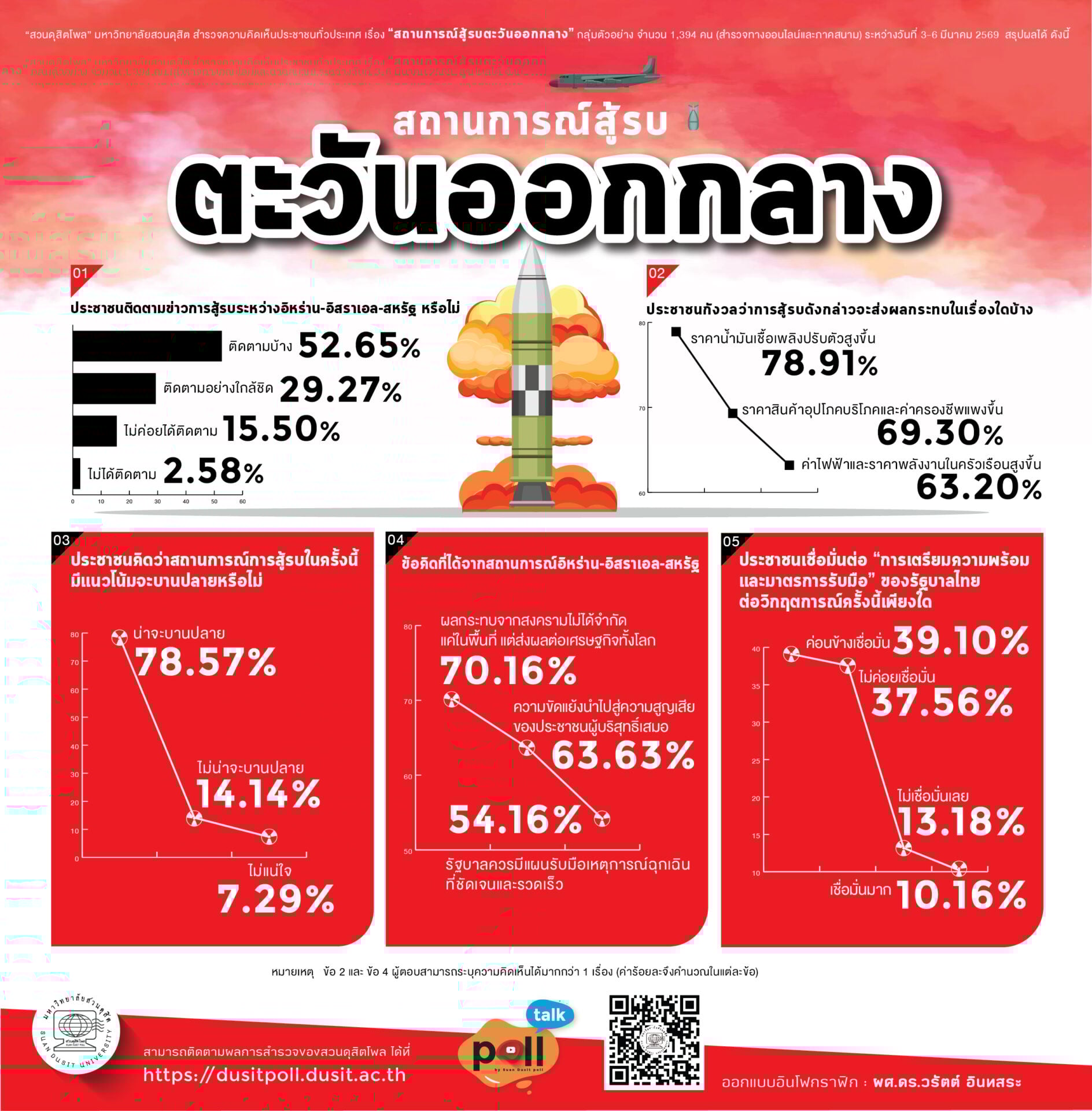 8 มี.ค. 2569 – “สวนดุสิตโพล” มหาวิทยาลัยสวนดุสิต สำรวจความคิดเห็นประชาชนทั่วประเทศ เรื่อง “สถานการณ์สู้รบตะวันออกกลาง” กลุ่มตัวอย่างจำนวน 1,394 คน (สำรวจทางออนไลน์และภาคสนาม) ระหว่างวันที่ 3-6 มีนาคม 2569 ผลการสำรวจ พบว่า จากการสู้รบระหว่างอิหร่าน-อิสราเอล-สหรัฐ กลุ่มตัวอย่างติดตามข่าวบ้าง ร้อยละ 52.65 โดยกังวลว่าการสู้รบจะส่งผลกระทบต่อราคาน้ำมันเชื้อเพลิงปรับตัวสูงขึ้น ร้อยละ 78.91 และคิดว่าสถานการณ์สู้รบจะบานปลาย ร้อยละ 78.57 ข้อคิดที่ได้ คือ ผลกระทบจากสงครามไม่ได้จำกัดแค่ในพื้นที่แต่ส่งผลต่อเศรษฐกิจทั้งโลก ร้อยละ 70.16 ในภาพรวมเชื่อมั่นต่อการเตรียมพร้อมและมาตรการรับมือของรัฐบาลไทย ร้อยละ 39.10 และไม่ค่อยเชื่อมั่น ร้อยละ 37.56