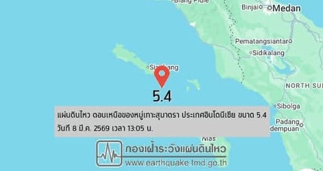 8 มี.ค.2569-เพจกรมอุตุนิยมวิทยา รายงานการเกิดแผ่นดินไหว เวลา 13:05 น. ตอนเหนือของหมู่เกาะสุมาตรา ประเทศอินโดนีเซีย (2.068N,96.631E) ขนาด 5.4 ทางทิศตะวันตกเฉียงใต้ของ อ.เมือง จ.สตูล ประมาณ 638 กม.