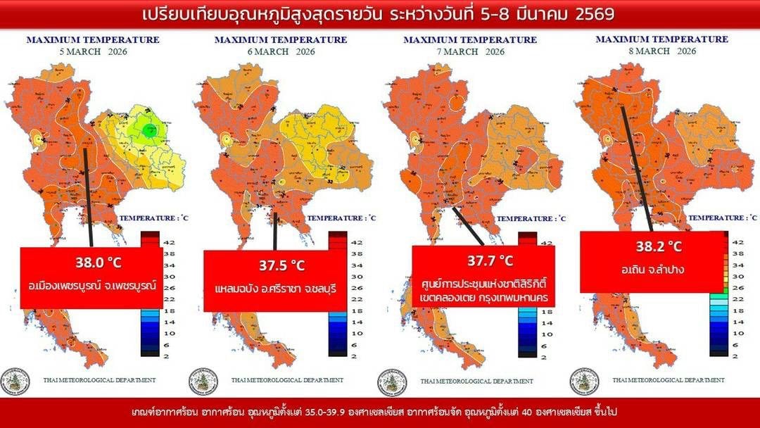 9 มี.ค. 2569 – กรมอุตุนิยมวิทยา รายงานอุณหภูมิสูงสุดรายภาคทั่วประเทศ จากสถานีตรวจวัดของกรมอุตุนิยมวิทยา โดยอุณหภูมิสูงสุดของประเทศไทย เมื่อวานนี้ (8 มี.ค. 69) วัดได้ 38.2 องศาเซลเซียส ที่ อ.เถิน จ.ลำปาง