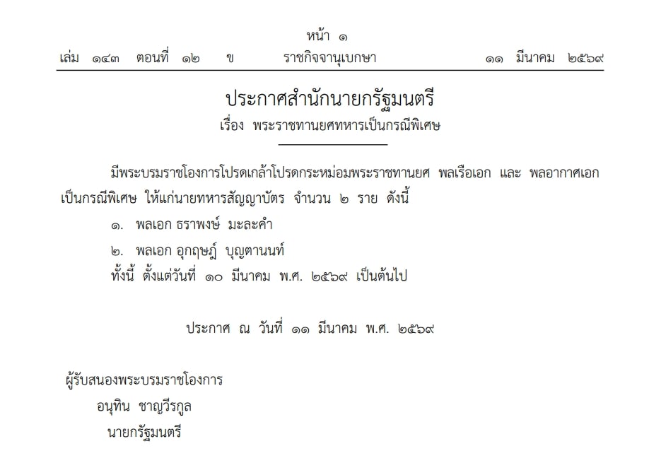 12 มีนาคม 2569 - เว็บไซต์ราชกิจจานุเบกษา เผยแพร่ประกาศสำนักนายกรัฐมนตรี เรื่อง พระราชทานยศทหารเป็นกรณีพิเศษ