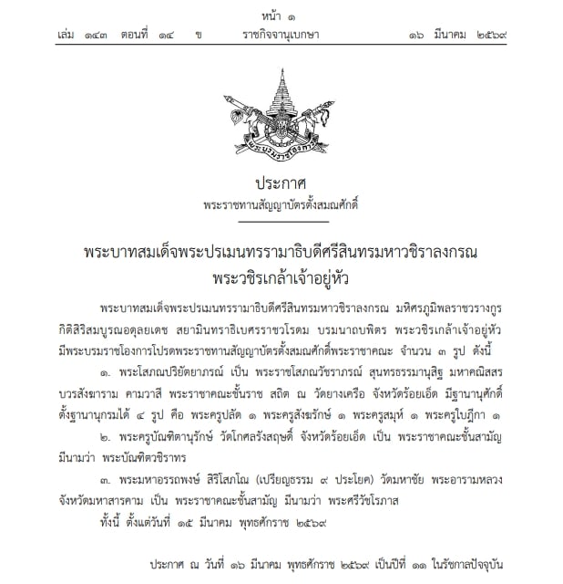 16 มีนาคม 2569 - เว็บไซต์ราชกิจจานุเบกษา เผยแพร่ประกาศพระราชทานสัญญาบัตรตั้งสมณศักดิ์