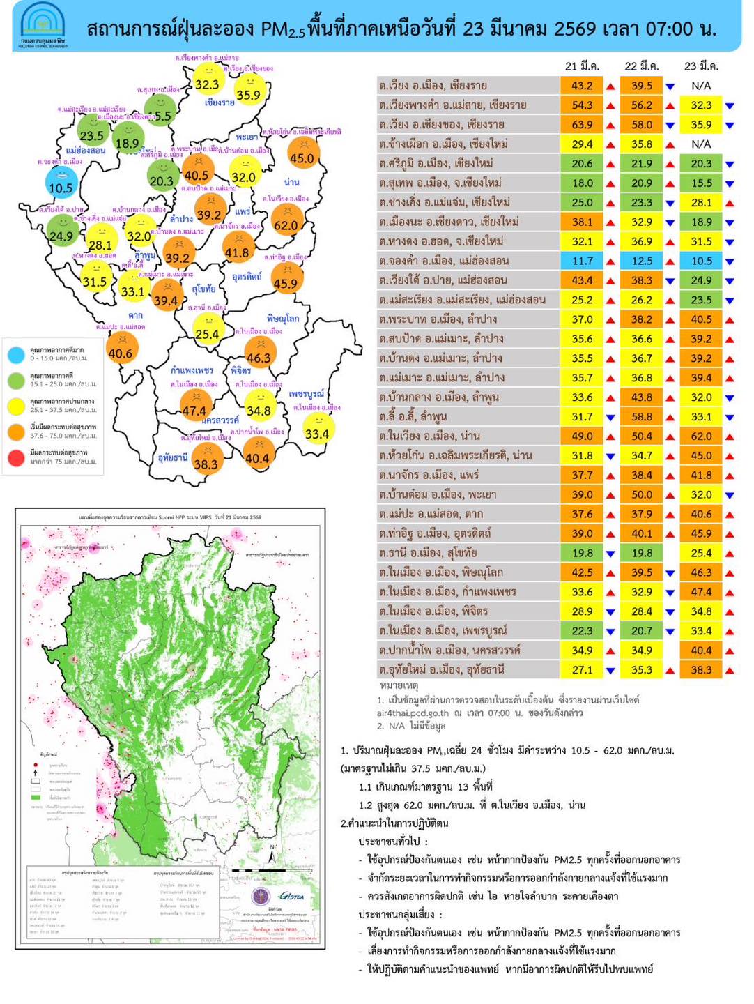 ภาพรวมปริมาณ PM2.5 ในประเทศ พบเกินค่ามาตรฐานใน จ.น่าน จ.ลำปาง จ.แพร่ จ.อุตรดิตถ์ จ.พิษณุโลก จ.ตาก จ.กำแพงเพชร จ.นครสวรรค์ จ.อุทัยธานี จ.สมุทรสงคราม จ.บึงกาฬ จ.หนองคาย จ.นครพนม จ.มุกดาหาร จ.ขอนแก่น จ.กาฬสินธุ์ จ.มหาสารคาม จ.ร้อยเอ็ด จ.อำนาจเจริญ จ.ยโสธร จ.อุบลราชธานี และ จ.ศรีสะเกษ