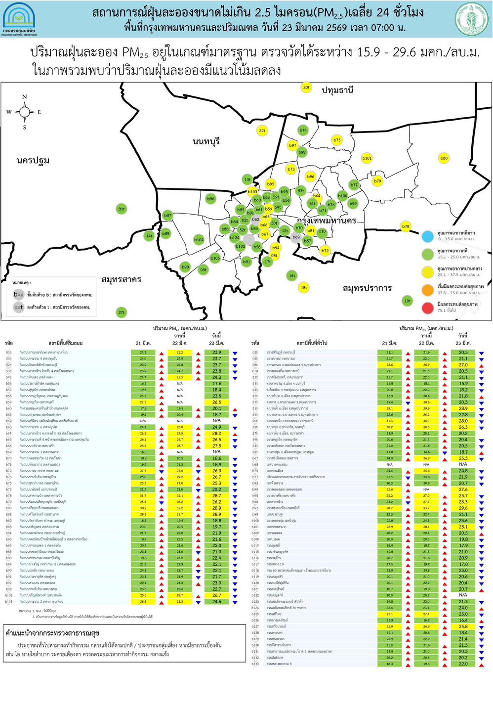 23 มี.ค. 2569 – ศูนย์สื่อสารการแก้ไขปัญหามลพิษทางอากาศ รายงานการติดตามตรวจสอบคุณภาพอากาศประจำวัน ณ 07:00 น. สรุปดังนี้