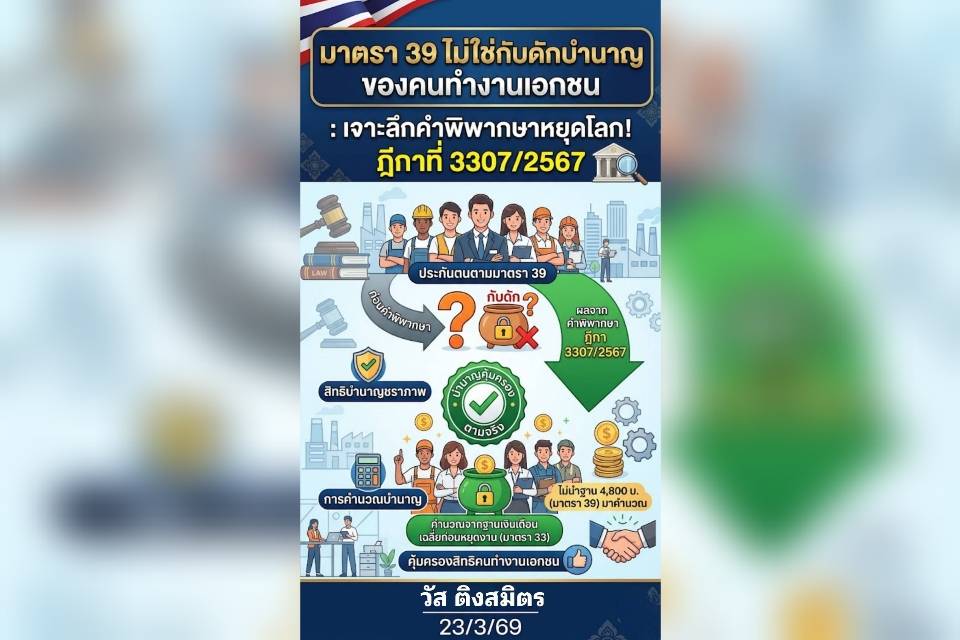 23 มี.ค.2569-วัส ติงสมิตร นักวิชาการอิสระ โพสต์เฟซบุ๊กเรื่อง “มาตรา 39 ไม่ใช่กับดักบำนาญ”: เจาะลึกคำพิพากษาหยุดโลก! ฎีกาที่ 3307/2567 เนื้อหาระบุว่า เคยสงสัยไหมครับ? อุตส่าห์ทำงานส่งประกันสังคมมาค่อนชีวิตด้วยเงินเดือนสูง (มาตรา 33) แต่พอลาออกแล้วอยากรักษาสิทธิรักษาพยาบาลต่อ เลยสมัครเป็นผู้ประกันตนภาคสมัครใจ (มาตรา 39) กลับกลายเป็นว่า “บำนาญชราภาพ” ที่ควรจะได้เยอะๆ กลับลดฮวบลงจนน่าตกใจ!