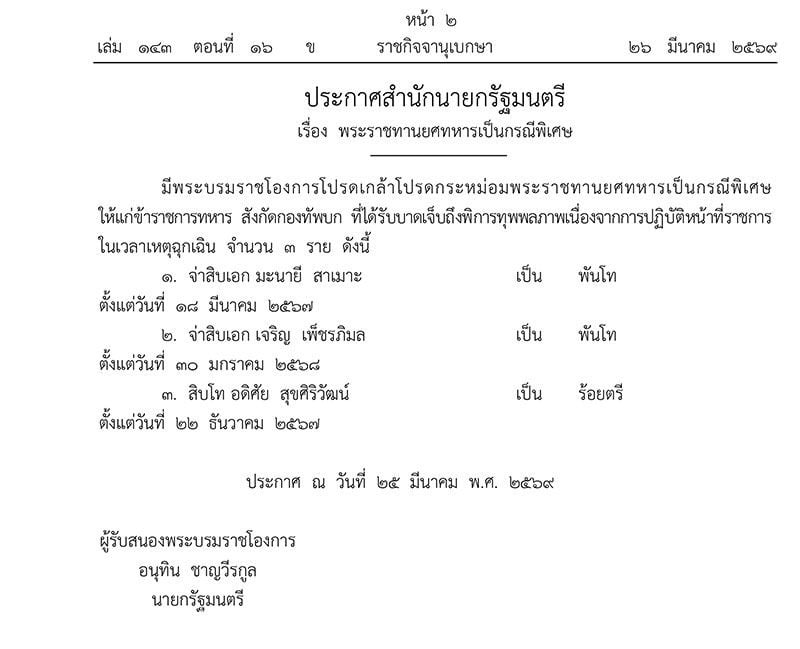 มีพระบรมราชโองการโปรดเกล้าโปรดกระหม่อมพระราชทานยศทหารเป็นกรณีพิเศษให้แก่ข้าราชการทหาร สังกัดกองทัพบก ที่ได้รับบาดเจ็บถึงพิการทุพพลภาพเนื่องจากการปฏิบัติหน้าที่ราชการในเวลาเหตุฉุกเฉิน จำนวน 3 ราย ดังนี้