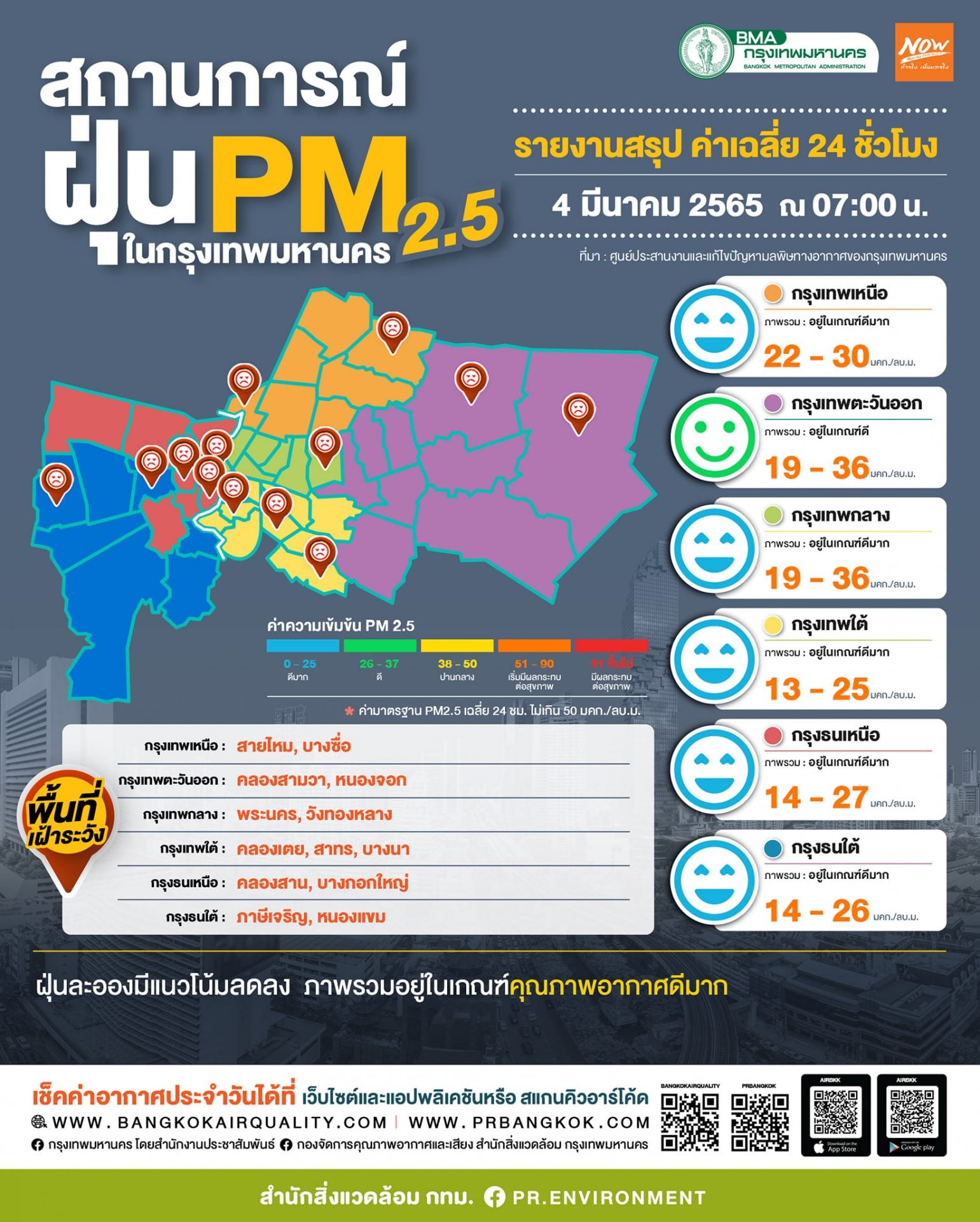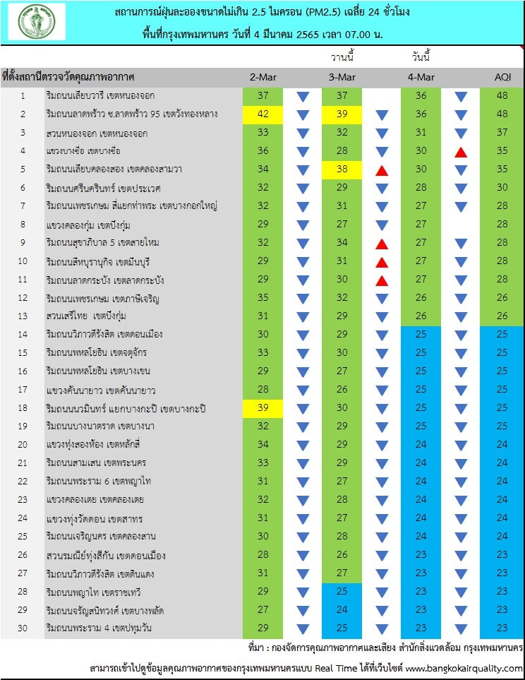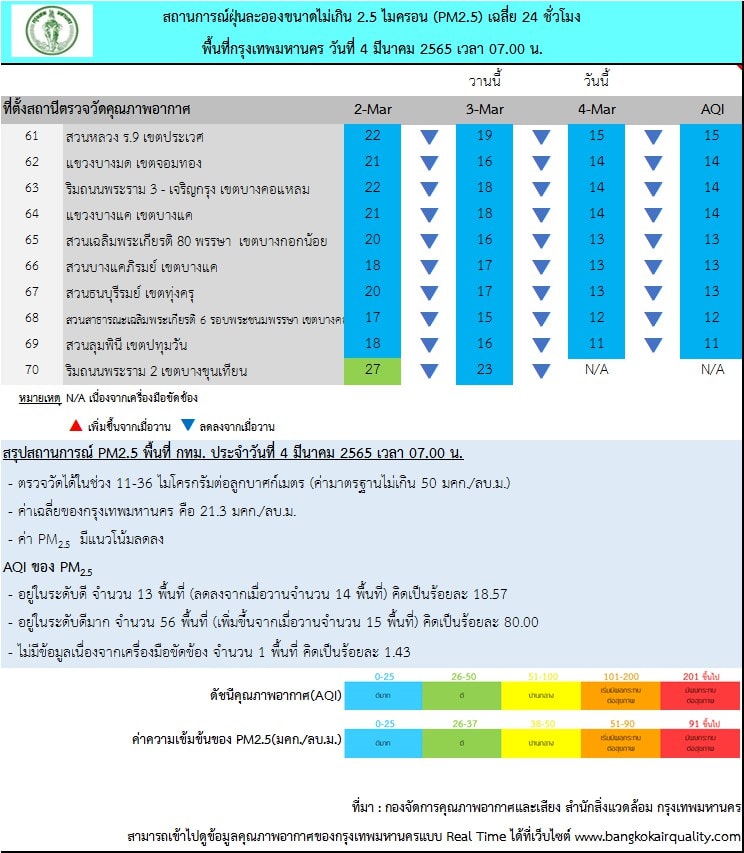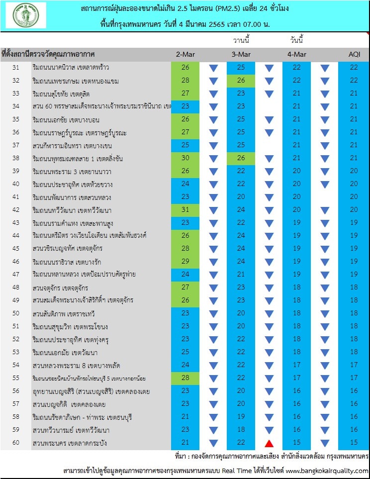 4 มี.ค. 2565 – ศูนย์ประสานงานและแก้ไขปัญหามลพิษทางอากาศในกรุงเทพมหานคร รายงานสถานการณ์ฝุ่นละอองขนาดไม่เกิน 2.5 ไมครอน (PM 2.5) ของสถานีตรวจวัดคุณภาพอากาศของกรุงเทพมหานคร ประจำวันศุกร์ที่ 4 มีนาคม พ.ศ. 2565 เวลา 07.00 น. ค่าเฉลี่ย 24 ชั่วโมง ของฝุ่นละอองขนาดไม่เกิน 2.5 ไมครอน (PM2.5)
