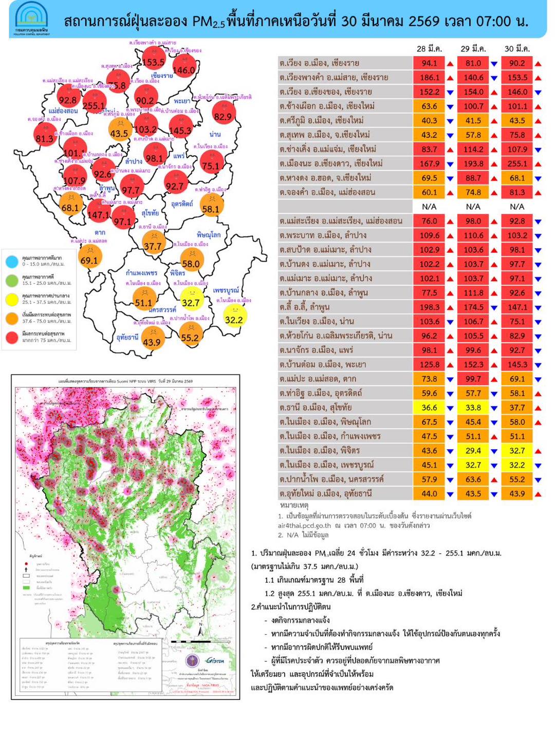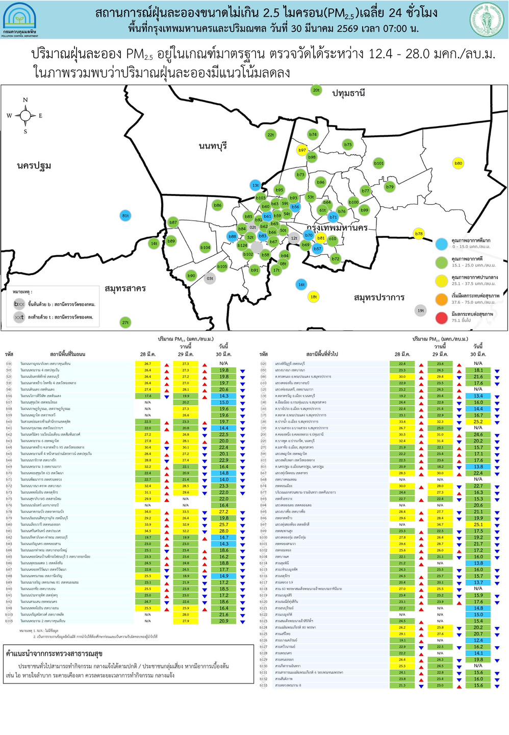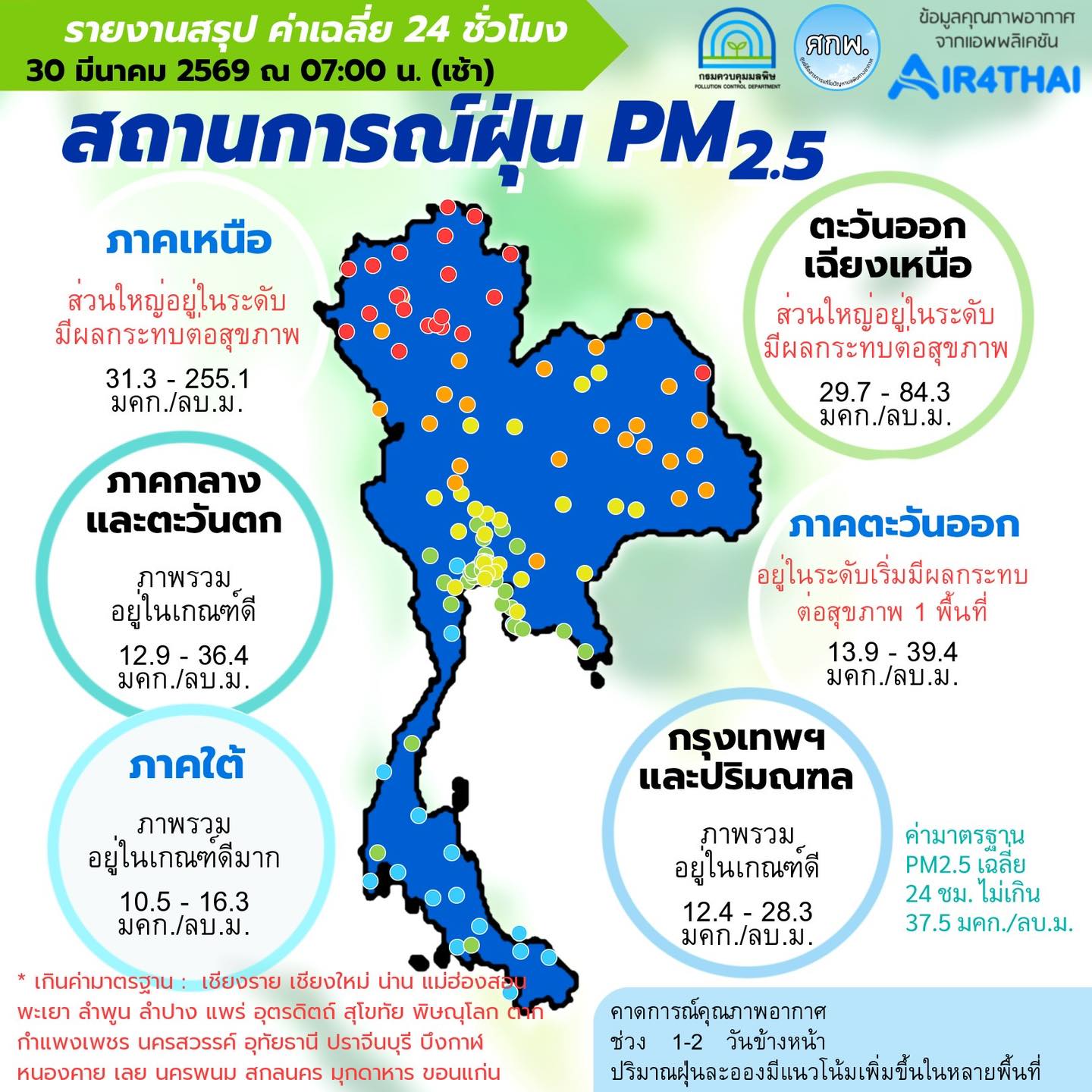 30 มี.ค. 2569 – ศูนย์สื่อสารการแก้ไขปัญหามลพิษทางอากาศ รายงานการติดตามตรวจสอบคุณภาพอากาศ ประจำวันที่ 30 มีนาคม 2569 ณ 07:00 น. สรุปดังนี้