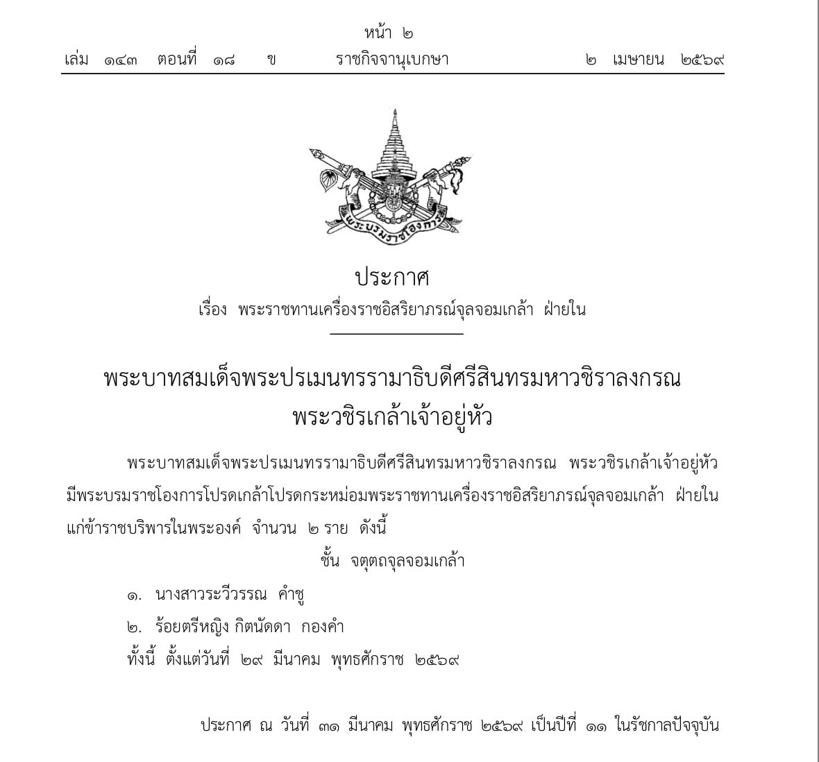 3 เมษายน 2569 - เว็บไซต์ราชกิจจานุเบกษา เผยแพร่ประกาศ เรื่อง พระราชทานเครื่องราชอิสริยาภรณ์จุลจอมเกล้า ฝ่ายใน