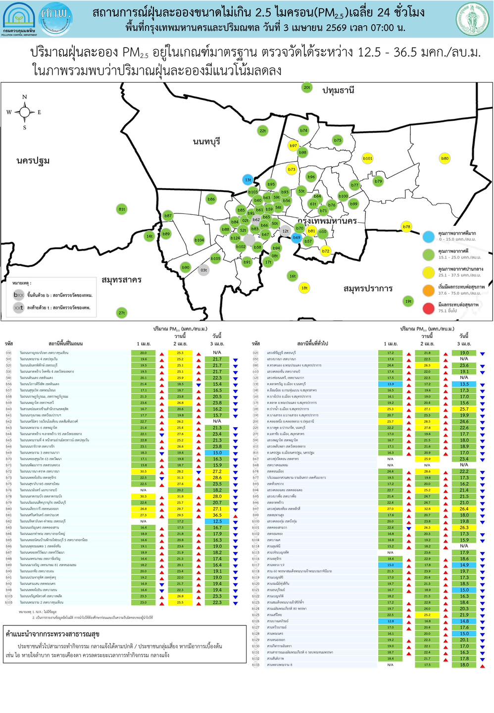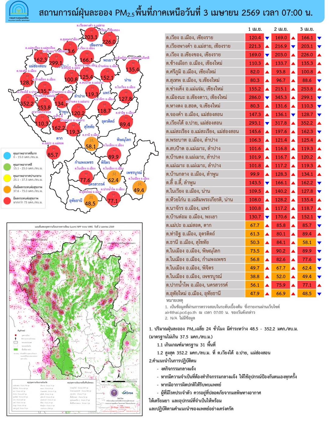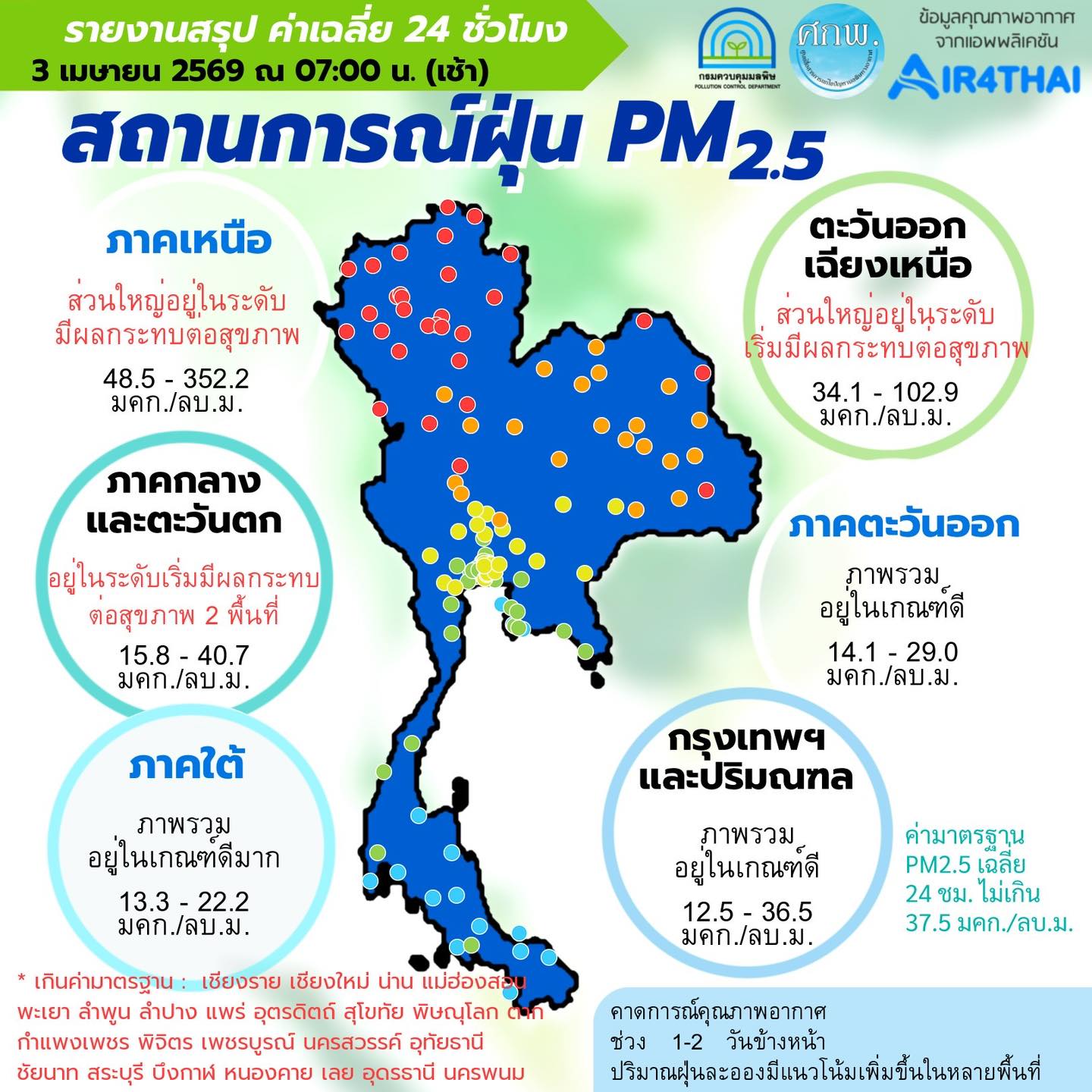 3 เม.ย. 2569 – ศูนย์สื่อสารการแก้ไขปัญหามลพิษทางอากาศ รายงานการติดตามตรวจสอบคุณภาพอากาศ ประจำวันที่ 3 เมษายน 2569 ณ 07:00 น. สรุปดังนี้