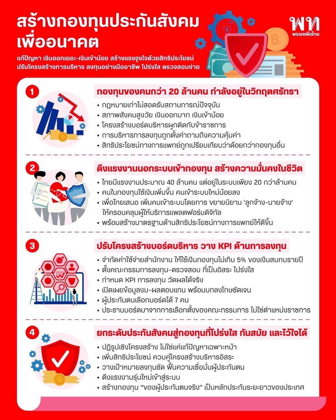 4 เมษายน 2569 - เพจเฟซบุ๊กพรรคเพื่อไทยโพสต์ข้อความ พร้อมภาพ กรณีกองทุนประกันสังคม ว่า กองทุนของคนกว่า 20 ล้านคน กำลังยืนอยู่บนจุดเปลี่ยนสำคัญของความเชื่อมั่น ภายใต้บริบทที่กฎหมายเดิมไม่ทันต่อการเปลี่ยนแปลงของโลกแรงงาน สังคมไทยก้าวเข้าสู่สังคมสูงวัยอย่างเต็มรูปแบบ ขณะที่เงินไหลออกมากกว่าเงินไหลเข้า การบริหาร และการลงทุนถูกตั้งคำถาม และสิทธิประโยชน์ยังไม่ตอบโจทย์ชีวิตแรงงานยุคใหม่