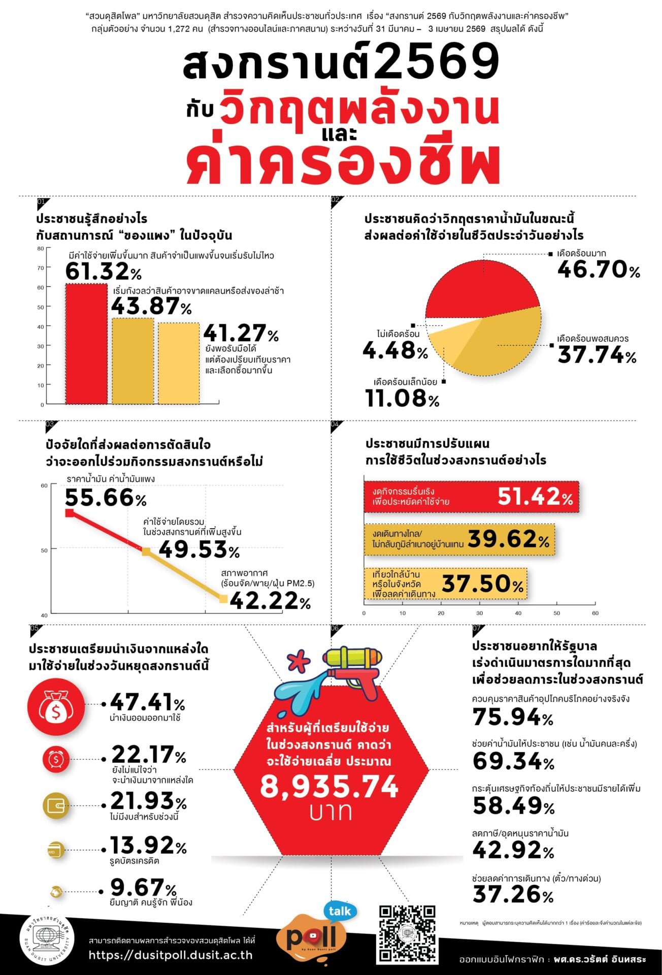 5 เมษายน 2569 – “สวนดุสิตโพล” มหาวิทยาลัยสวนดุสิต สำรวจความคิดเห็นประชาชนทั่วประเทศ เรื่อง “สงกรานต์ 2569 กับวิกฤตพลังงานและค่าครองชีพ” กลุ่มตัวอย่างจำนวน 1,272 คน (สำรวจทางออนไลน์และภาคสนาม) ระหว่างวันที่ 31 มีนาคม– 3 เมษายน 2569 ผลการสำรวจ พบว่า จากสถานการณ์ของแพง กลุ่มตัวอย่างรู้สึกว่ามีค่าใช้จ่ายเพิ่มขึ้นมาก โดยเฉพาะสินค้าจำเป็นที่แพงขึ้นจนเริ่มรับไม่ไหว ร้อยละ 61.32 และวิกฤตราคาน้ำมันในขณะนี้ส่งผลให้เดือดร้อนมาก ร้อยละ 46.70 สำหรับปัจจัยที่เกี่ยวข้องกับการตัดสินใจออกไปร่วมกิจกรรมสงกรานต์ คือ ราคาน้ำมัน ร้อยละ 55.66 โดยมีการปรับแผนการใช้ชีวิตในช่วงสงกรานต์ด้วยการงดกิจกรรมรื่นเริงเพื่อประหยัดค่าใช้จ่าย ร้อยละ 51.42 ในช่วงวันหยุดสงกรานต์นี้กลุ่มตัวอย่างเตรียมนำเงินออมออกมาใช้มากที่สุด ร้อยละ 47.41 คาดว่าจะมีค่าใช้จ่ายเฉลี่ยประมาณ 8,935.74 บาท ทั้งนี้กลุ่มตัวอย่างอยากให้รัฐบาลเร่งดำเนินการควบคุมราคาสินค้าอุปโภคบริโภคอย่างจริงจัง เพื่อช่วยลดภาระค่าใช้จ่ายในช่วงสงกรานต์ ร้อยละ 75.94