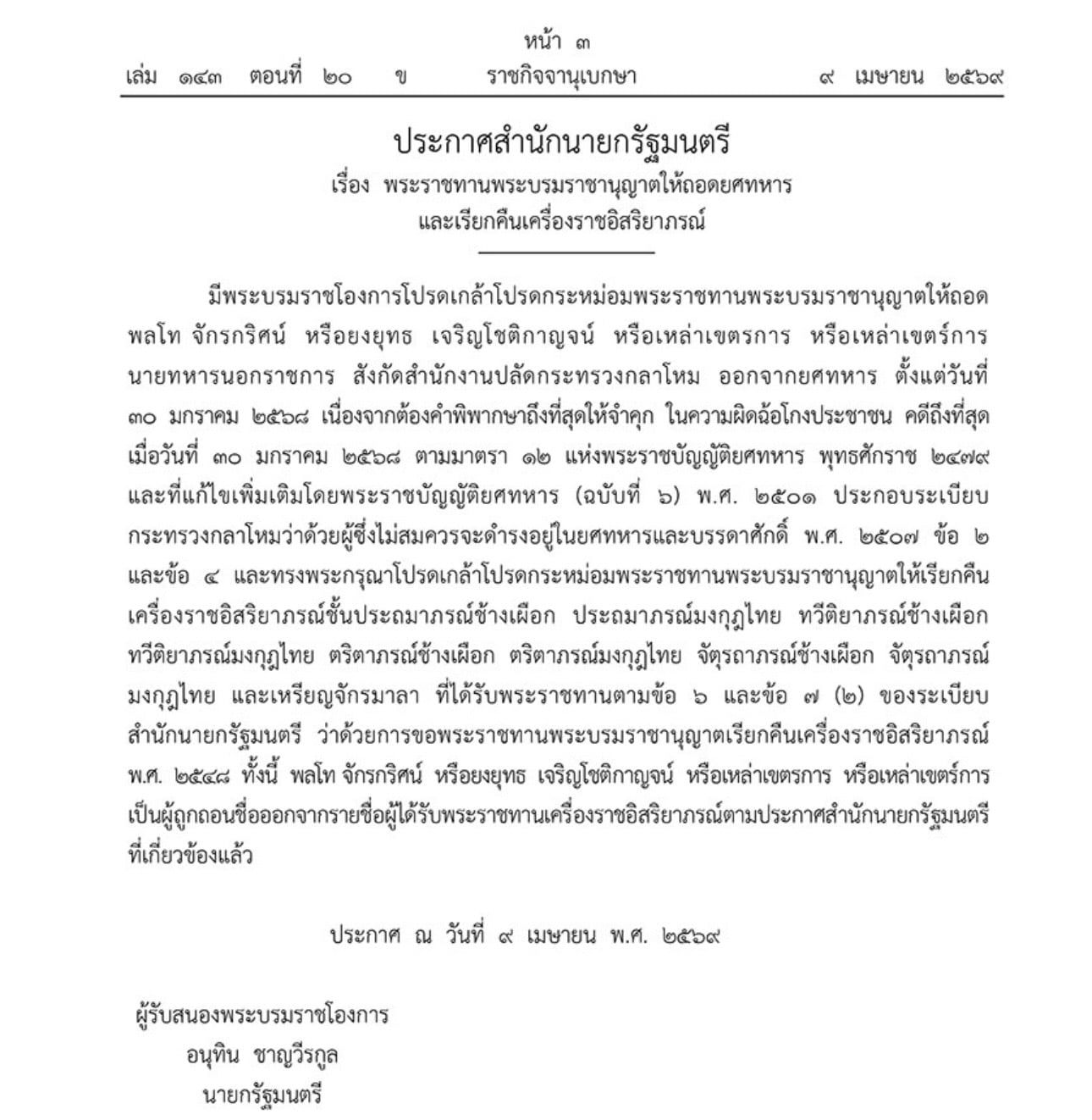 10 เมษายน 2569 - เว็บไซต์ราชกิจจานุเบกษา เผยแพร่ประกาศสำนักนายกรัฐมนตรี เรื่อง พระราชทานพระบรมราชานุญาตให้ถอดยศทหารและเรียกคืนเครื่องราชอิสริยาภรณ์