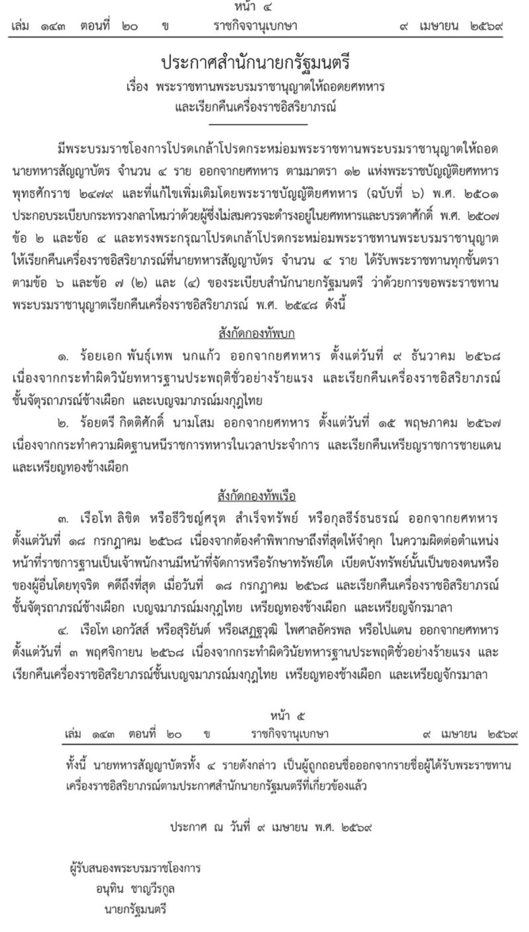4. เรือโท เอกวัสส์ หรือสุริยันต์ หรือเสฎฐวุฒิ ไพศาลอัครพล หรือไปแดน ออกจากยศทหาร ตั้งแต่วันที่ 3 พฤศจิกายน 2568 เนื่องจากกระทำผิดวินัยทหารฐานประพฤติชั่วอย่างร้ายแรง และเรียกคืนเครื่องราชอิสริยาภรณ์ชั้นเบญจมาภรณ์มงกุฎไทย เหรียญทองช้างเผือก และเหรียญจักรมาลา