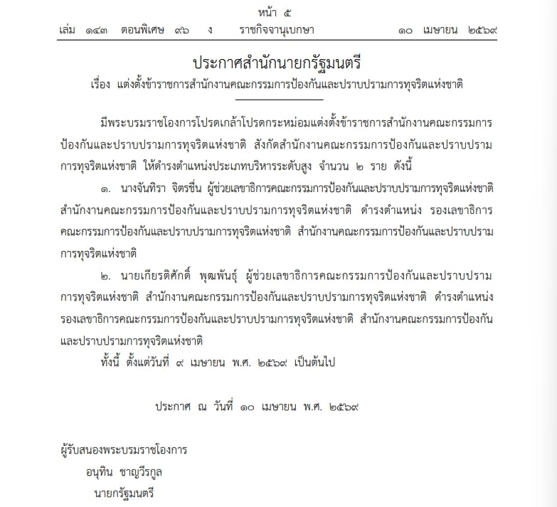11 เมษายน 2569 - เว็บไซต์ราชกิจจานุเบกษา เผยแพร่ประกาศสำนักนายกรัฐมนตรีเรื่อง แต่งตั้งข้าราชการสำนักงานคณะกรรมการป้องกันและปราบปรามการทุจริตแห่งชาติ