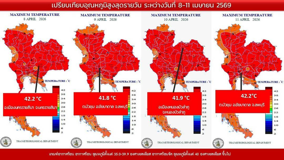 12 เม.ย.2569 – เฟซบุ๊ก กรมอุตุนิยมวิทยา ระบุข้อความ อุณหภูมิสูงสุดบริเวณประเทศไทย เมื่อวานนี้ (11 เม.ย. 69) วัดได้ 42.2 องศาเซลเซียส ที่ ต.บัวชุม อ.ชัยบาดาล จ.ลพบุรี