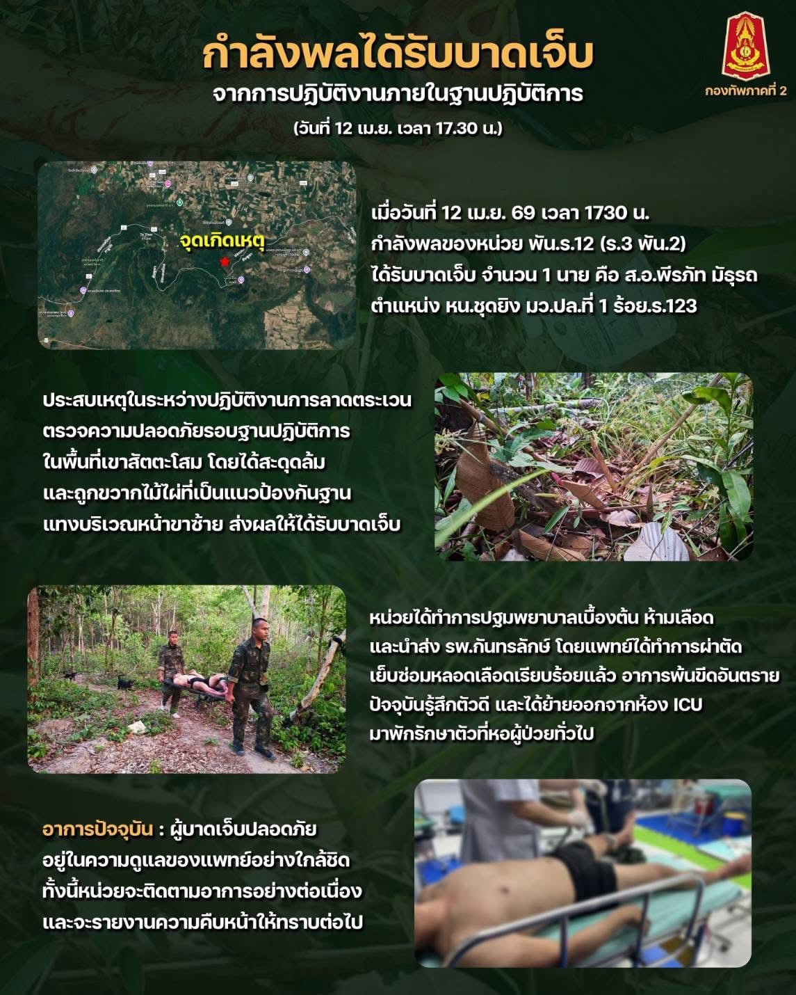 13 เมษายน 2569 - กองทัพภาคที่ 2 ได้ชี้แจงกรณีกำลังพลได้รับบาดเจ็บระหว่างปฏิบัติหน้าที่ในพื้นที่เขาสัตตะโสม อำเภอกันทรลักษ์ จังหวัดศรีสะเกษ
