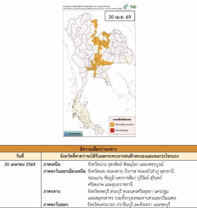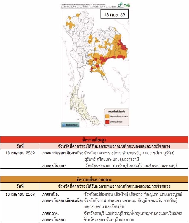 กรมอุตุนิยมวิทยา ออกประกาศเรื่อง พายุฤดูร้อนบริเวณประเทศไทยตอนบน (มีผลกระทบตั้งแต่วันที่ 16-20 เมษายน 2569) ฉบับที่ 4