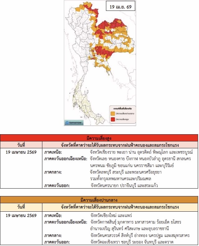 เช็กที่นี่! กรมอุตุฯ อัปเดต 'พายุฤดูร้อน' 16-20 เม.ย. ถล่มจังหวัดใดบ้างระดับเสี่ยงสูง-ปานกลาง