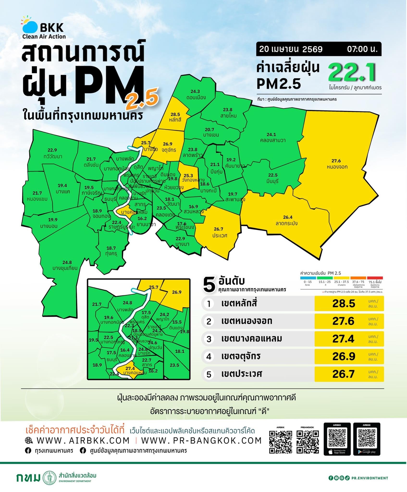 20 เม.ย.2569-เพจศูนย์ข้อมูลคุณภาพอากาศ กรุงเทพมหานคร รายงานสถานการณ์ฝุ่นละอองขนาดไม่เกิน 2.5 ไมครอน (PM 2.5) ในกรุงเทพมหานคร ประจำวันที่ 20 เมษายน 2569 เวลา 07:00 น. ค่าเฉลี่ยของกรุงเทพมหานคร 21.1 ไมโครกรัมต่อลูกบาศก์เมตร (มคก./ลบ.ม.) (ค่ามาตรฐานไม่เกิน 37.5 มค.ก./ลบ.ม.)